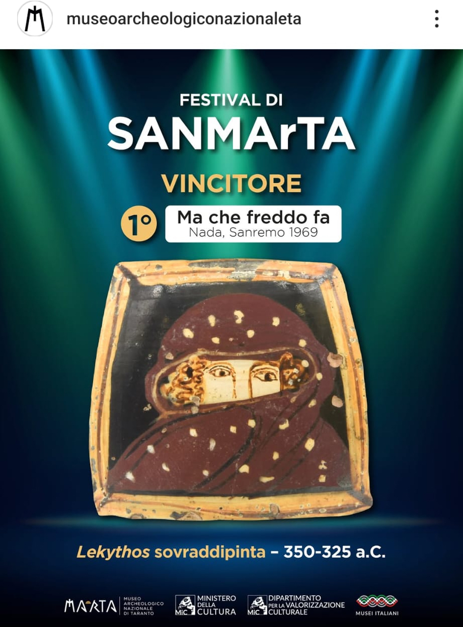 E così, nel museo principe della Magna Grecia per tutta la durata del festival di Sanremo c’è stata una gara tra «Vola colomba» di Nilla Pizzi, abbinata a un balsamario in vetro a forma di colombina della prima metà del I secolo d.C.; «Ventiquattromila baci» di Adriano Celentano, rappresentata da un gruppo fittile di inizio III secolo a.C. che raffigura una coppia distesa su kline, lasciva e felice tra baci, abbracci e musica (la figura maschile regge una cetra nella mano sinistra); il successo targato anni ’60 di Nada «Ma che freddo fa», evocato dal volto di una donna misteriosa completamente avvolta in un himation da cui fuoriescono solo gli occhi e il naso, sovraddipinta in ocra e amaranto sul lucido fondo nero di una lekythos datata al 350-325 a.C.; l’immancabile «Felicità» di Al Bano e Romina Power materializzatasi nella figurina fittile di un attore comico ed ebbro, ritrovata a Taranto e attribuita alla fine IV-inizi III secolo a.C.