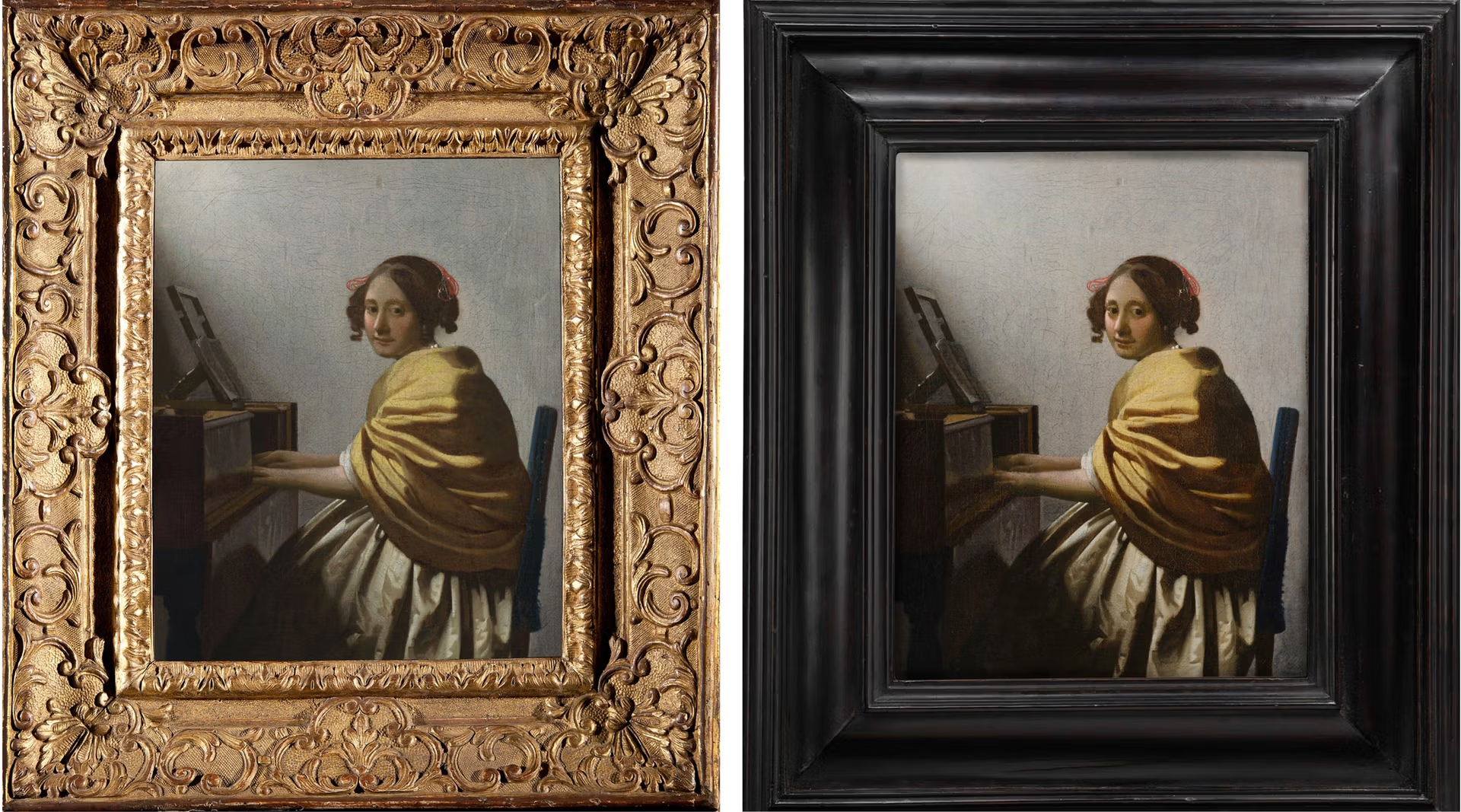 «La Giovane donna seduta al virginale» di Vermeer nella sua vecchia cornice dorata (a sinistra) e in quella nuova. Courtesy della Leiden Collection