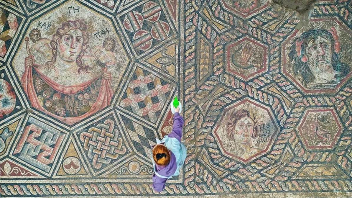 L’archeologo Yusuf Kahveci, che fa parte del team di scavo, ha dichiarato a un corrispondente dell’Agenzia Anadolu (AA) che, per il pavimento a mosaico scoperto durante i lavori fognari del 2014, le richieste di esproprio sono state avviate dopo aver accertato che esso continuava lungo la strada e il terreno adiacente. In base ai motivi, ai colori e ai modelli del mosaico, nonché a reperti come ceramiche e monete, gli esperti hanno stabilito che la struttura risale al III secolo d.C.