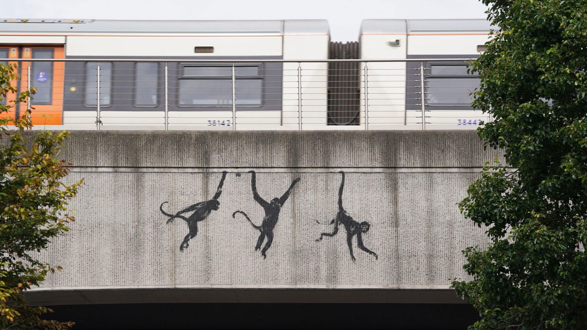 Tre scimmie di Banksy si dondolano da un ponte a Brick Lane. © Pa Media