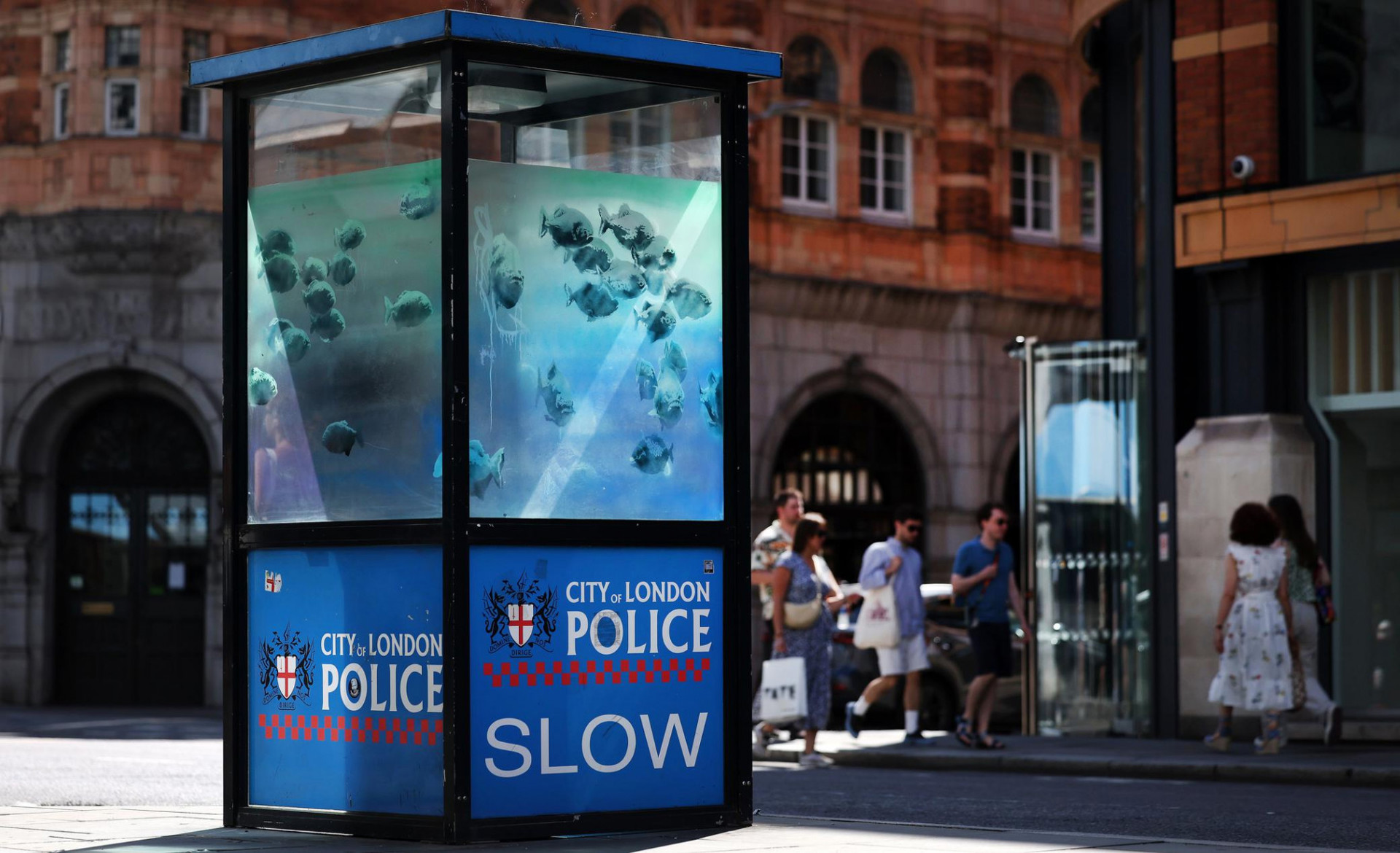 Un branco di piranha di Banksy sul vetro di una cabina della polizia di Ludgate Hill. Cortesia keystone-sda.ch (Andy Rain)