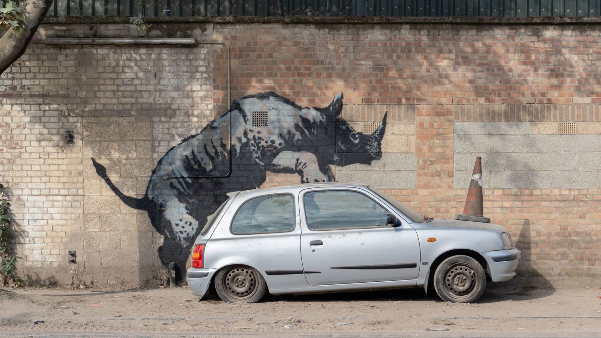 Un rinoceronte a grandezza naturale di Banksy apparso su un muro di Charlton. © Pa