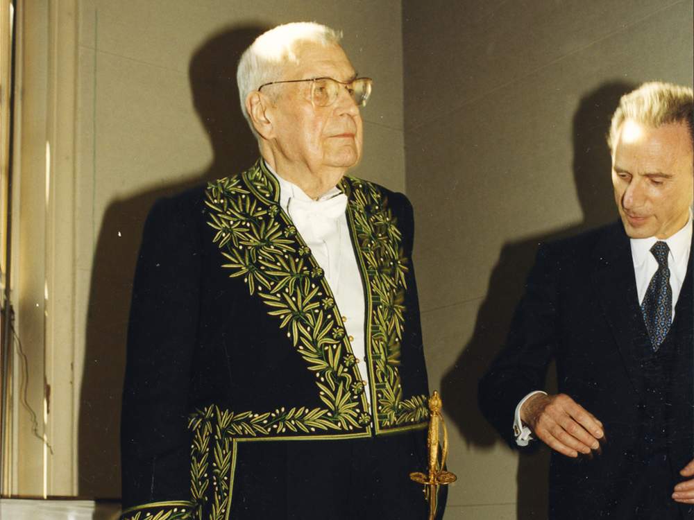 Pierre Rosenberg consegna a Federico Zeri la spada di Accademico di Francia nel 1997