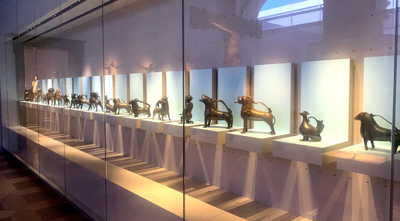La vetrina con una ventina di versatoi in bronzo a forma di animali fantastici