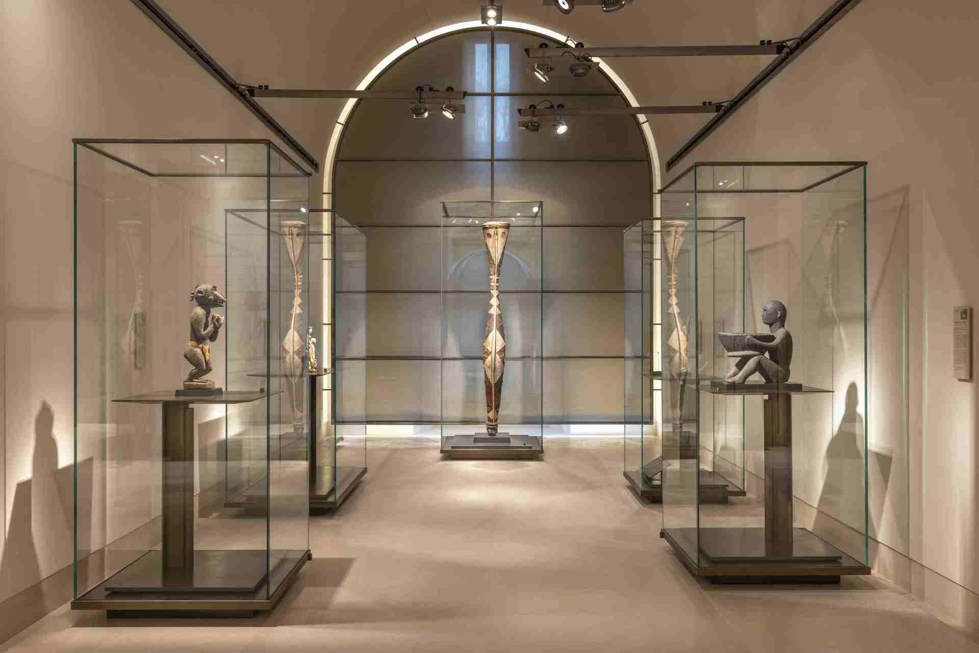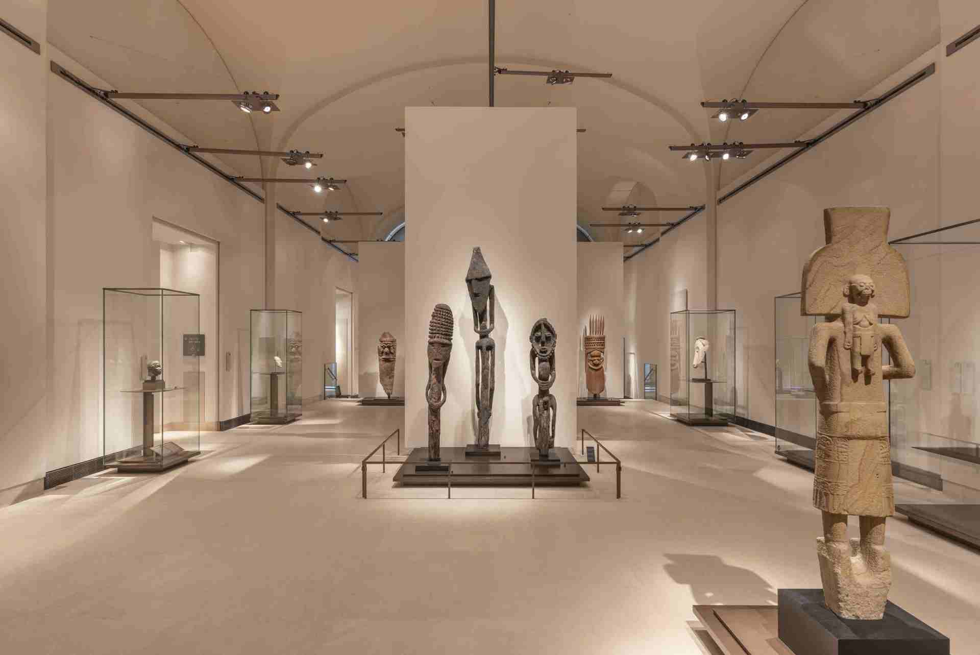 Ogni sala solleva questioni «metafisiche e antropologiche»: nascere e morire, credere, autorità e prestigio, celebrare il sacro, spiegare il mondo. «Interrogativi comuni a tutte le culture, presenti su tutti i continenti, ma a cui ogni civiltà umana ha dato risposte diverse», ha aggiunto Etchegoyen Glama. Un esempio arriva da una vetrina della sezione «Nascere e morire» che sembra riassumere la filosofia della Galleria. Vi sono esposti quattro «volti»: una maschera precolombiana in pietra nera del Teotihuacán (200-600 a.C.), un volto di «gisant» gotico francese (fine Trecento), una maschera funeraria siriana in oro martellato (I-II secolo d.C.) e una maschera divinatoria egiziana con barba amovibile (760-520 a.C.). Nella sala sul tema del potere, sembrano discutere silenziosamente, l'uno di fronte all'altro, l'«uomo blu», iconica scultura longilinea in legno policromo dell'isola di Malo, nell'oceano Pacifico (XIX secolo), e la statua in marmo del senatore romano Lucio Elio Cesare (136-138 d.C.), proveniente dalla Collezione Campana. Lungo il percorso ci si imbatte in opere sorprendenti, come la statuetta femminile in terracotta dipinta della cultura Chupicuaro (Messico, 600 a.C.-200 d.C.) o il cane-medium «nkisi nkondi» del Congo, interamente ricoperto di chiodi (XVIII-XIX secolo).