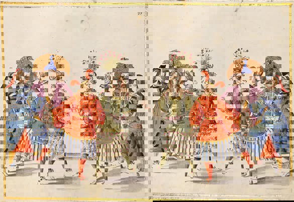 Tavola dell’album di Giovanni Tommaso Borgonio con una scena della coreografia di Filippo d’Agliè per il balletto «Il Gridelino», messo in scena a Torino l’ultimo giorno di Carnevale del 1563, Torrino, Biblioteca Nazionale Universitaria