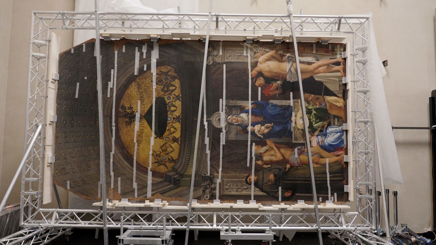 Data la complessità e le dimensioni dell’opera, si è scelto di non trasferire la pala in laboratorio. La sala che la ospita è stata temporaneamente ripensata per accogliere un cantiere di restauro appositamente progettato, capace di garantire condizioni operative adeguate, senza interrompere il percorso museale. Il laboratorio diventa così uno spazio visibile e accessibile, dove il pubblico potrà osservare i restauratori al lavoro e comprendere da vicino le pratiche della conservazione.