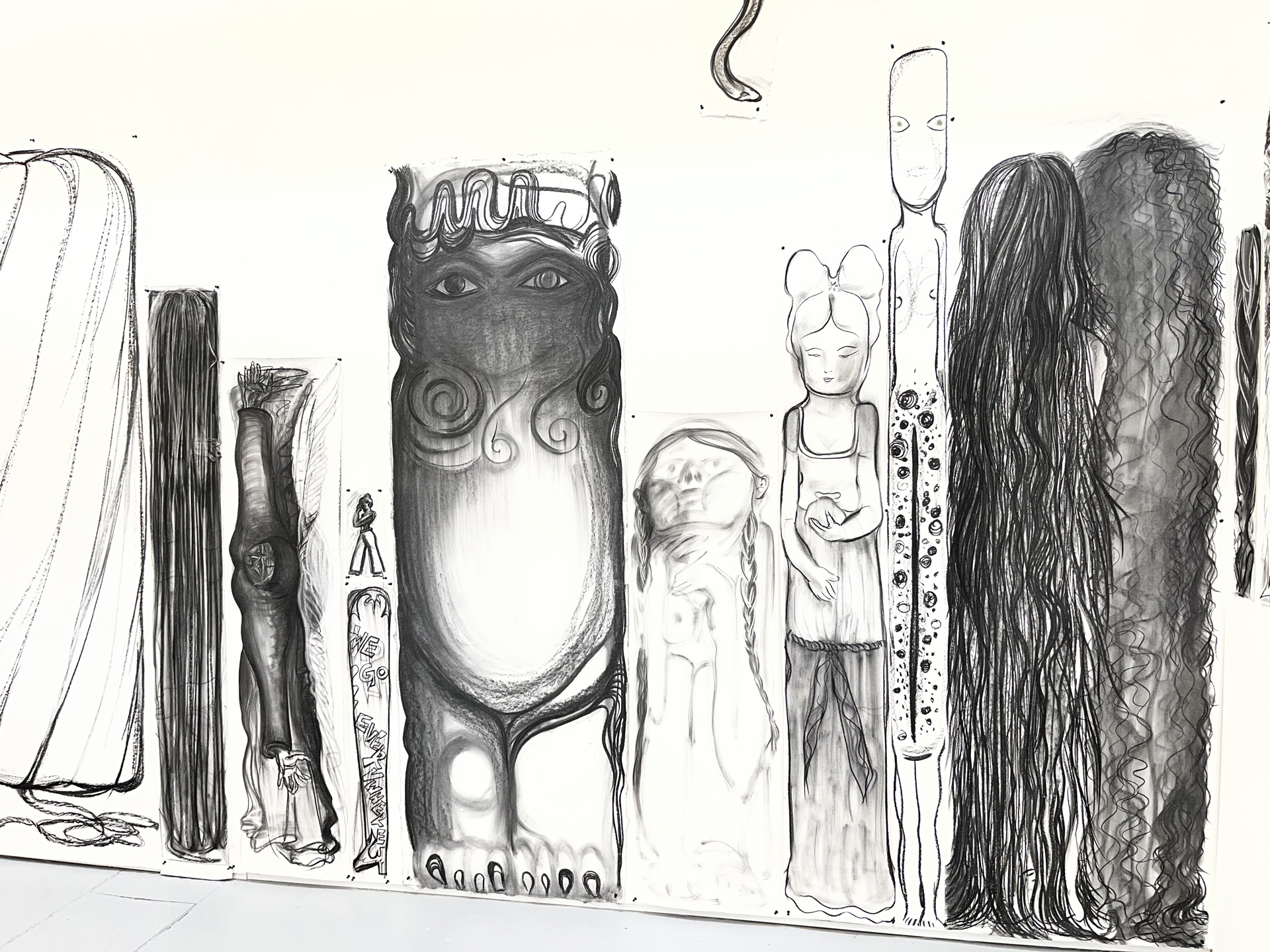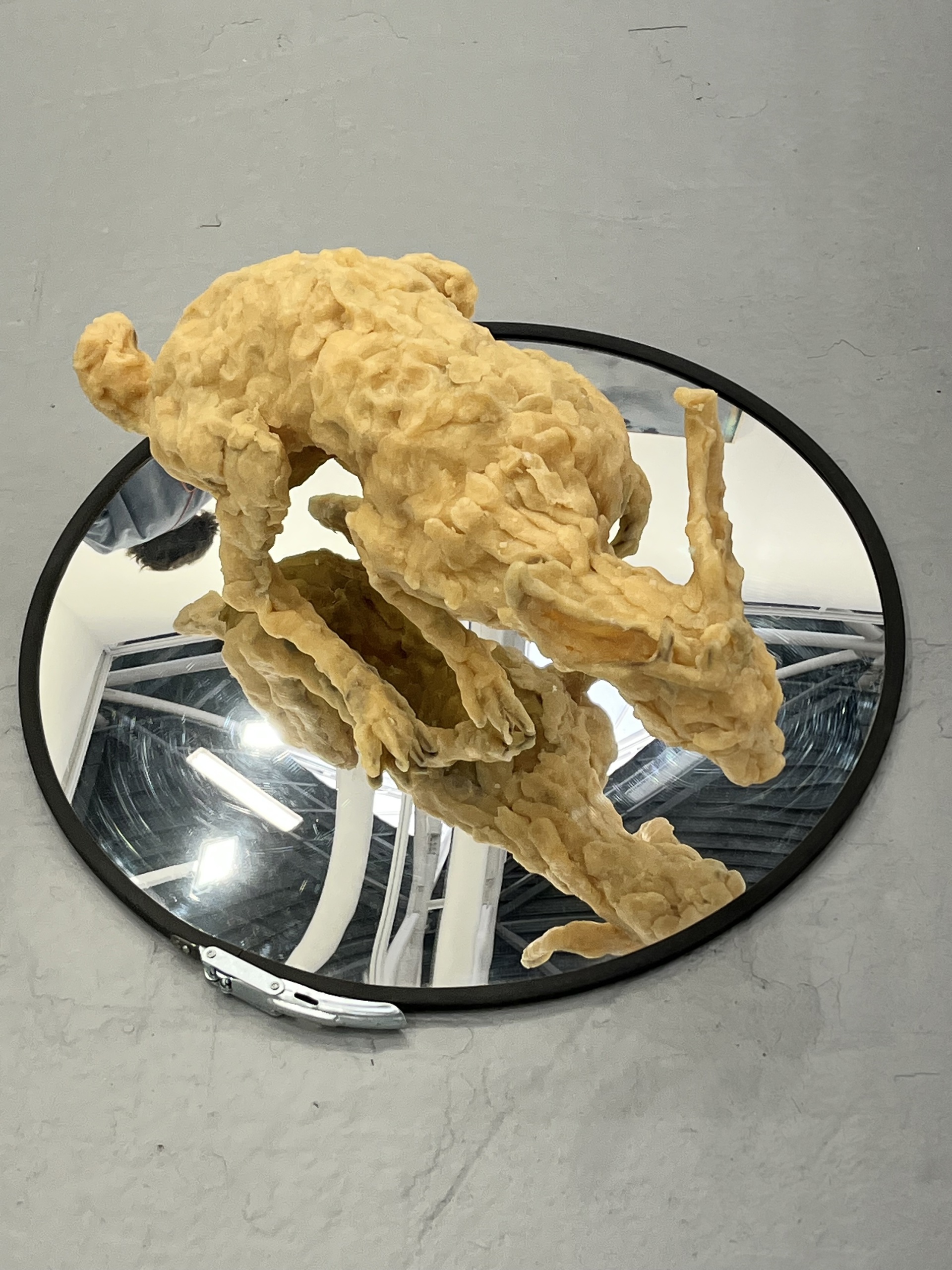 La presenza di Chiara Camoni (nello stand di SpazioA), conferma la scelta di un contemporaneo improntato su coerenza della ricerca, continuità istituzionale e solidità curatoriale, in piena coerenza con il tipo di pubblico e di sistema che Arte Fiera intercetta da sempre. Scelta per rappresentare l’Italia alla prossima Biennale di Venezia, l’artista lavora per stratificazione: gesto, ritualità, manualità, corpo e relazione non sono per lei linguaggi marginali, ma strutturali, in continuità con una tradizione italiana che dagli anni Sessanta e Settanta arriva fino alle pratiche relazionali e processuali più recenti. La sua è una pratica fondata su ritualità, sul gesto manuale e costruzione collettiva dell’immaginario, in una ricerca ormai consolidata sul piano curatoriale e istituzionale. Su un piano diverso ma complementare, il video di Hamza Badran, artista palestinese di stanza a Basilea (Gian Marco Casini) in cui il gesto del ballo matrimoniale viene ripetuto fino allo sfinimento, in un video a due canali, senza musica né contesto, un lavoro sul corpo come archivio culturale e politico, che trasforma una pratica sociale in linguaggio, memoria e resistenza fisica. Su un registro più intimo i disegni a carboncino, visionari e surreali, di Ding Yuchu Gao (ermes Ermes) lavorano sulla stratificazione del segno e sul tempo dell’immagine, costruendo figure sospese tra immaginario, corpo e trasformazione. Una componente simbolica e metamorfica emerge invece nella scultura di Bekhbaatar Enkhtur (Materia), raffigurante una lepre in cera posata su specchio, fragile e instabile, sospesa tra animale, mito e artificio, in un equilibrio precario tra materia organica, riflesso e costruzione simbolica.