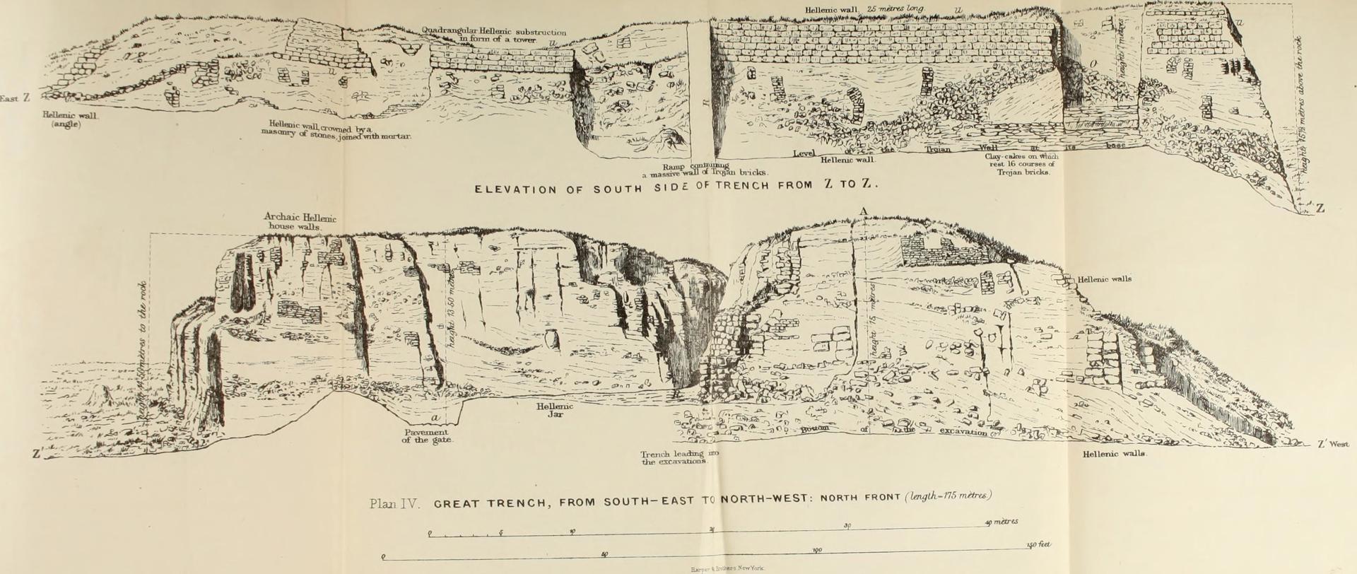 D’ora in poi Troia diventa un’ossessione, un’idea fissa che Schliemann fa risalire addirittura all’infanzia. Nei suoi scritti inventa una vocazione precoce che servirà a rinforzare il suo pedigree da archeologo, per non rivelare la verità: e cioè che invece lui è un assoluto autodidatta, arrivato a Troia per caso e per intuito. Calvert sprona Schliemann a scavare a Hissarlik fin dal loro primo incontro: ha capito che il tedesco possiede la disponibilità economica e la giusta dose di energia per raggiungere dei risultati. Il 9 aprile 1870 iniziano i lavori. Schliemann comincia a confrontarsi con lo scavo archeologico: apre prima delle trincee più piccole e poi il cosiddetto «trincerone»: un enorme taglio in verticale largo ben 79 metri e profondo 14, che attraversa tutta la collina di Hissarlik. È un’area di scavo gigantesca, dove è impossibile controllare l’attività di tutti gli operai. E infatti, nel corso di questo intervento viene distrutta una buona parte del sito, con danni irreparabili per la conoscenza. A Schliemann interessano soprattutto le strutture; scopre un complesso architettonico nel quale vede subito il Palazzo di Priamo e trova delle fortificazioni: la Porta Scea.