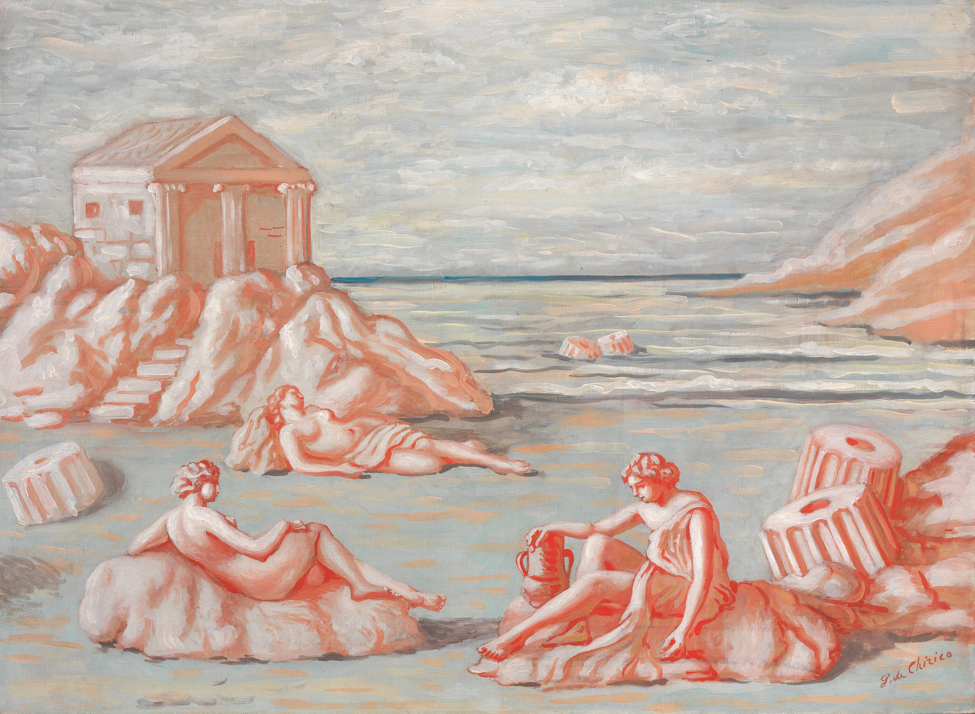 Giorgio de Chirico, «Le figlie di Minosse (Scena antica in rosa e azzurro II)», 1933, esposto alla Galleria d’Arte Frediano Farsetti. Courtesy Galleria d’Arte Frediano Farsetti