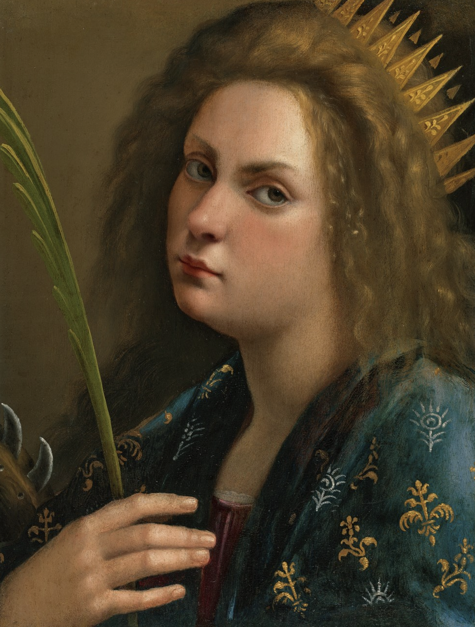 Il dipinto colpisce immediatamente per la sua forza visiva. Una giovane donna emerge dal fondo scuro, il volto è modellato da una luce calibrata; lo sguardo è diretto, fermo, capace di instaurare un rapporto immediato con l’osservatore. Artemisia si rappresenta come Santa Caterina d’Alessandria, riconoscibile dagli attributi iconografici - la palma del martirio, la ruota spezzata, la corona e il mantello riccamente ornato - ma la composizione è dominata dal suo volto, ravvicinato e centrale, che occupa quasi interamente lo spazio pittorico. La rotazione del capo suggerisce l’uso di uno specchio, una soluzione che l’artista adotterà anche in altri autoritratti fiorentini oggi a Hartford e Londra.