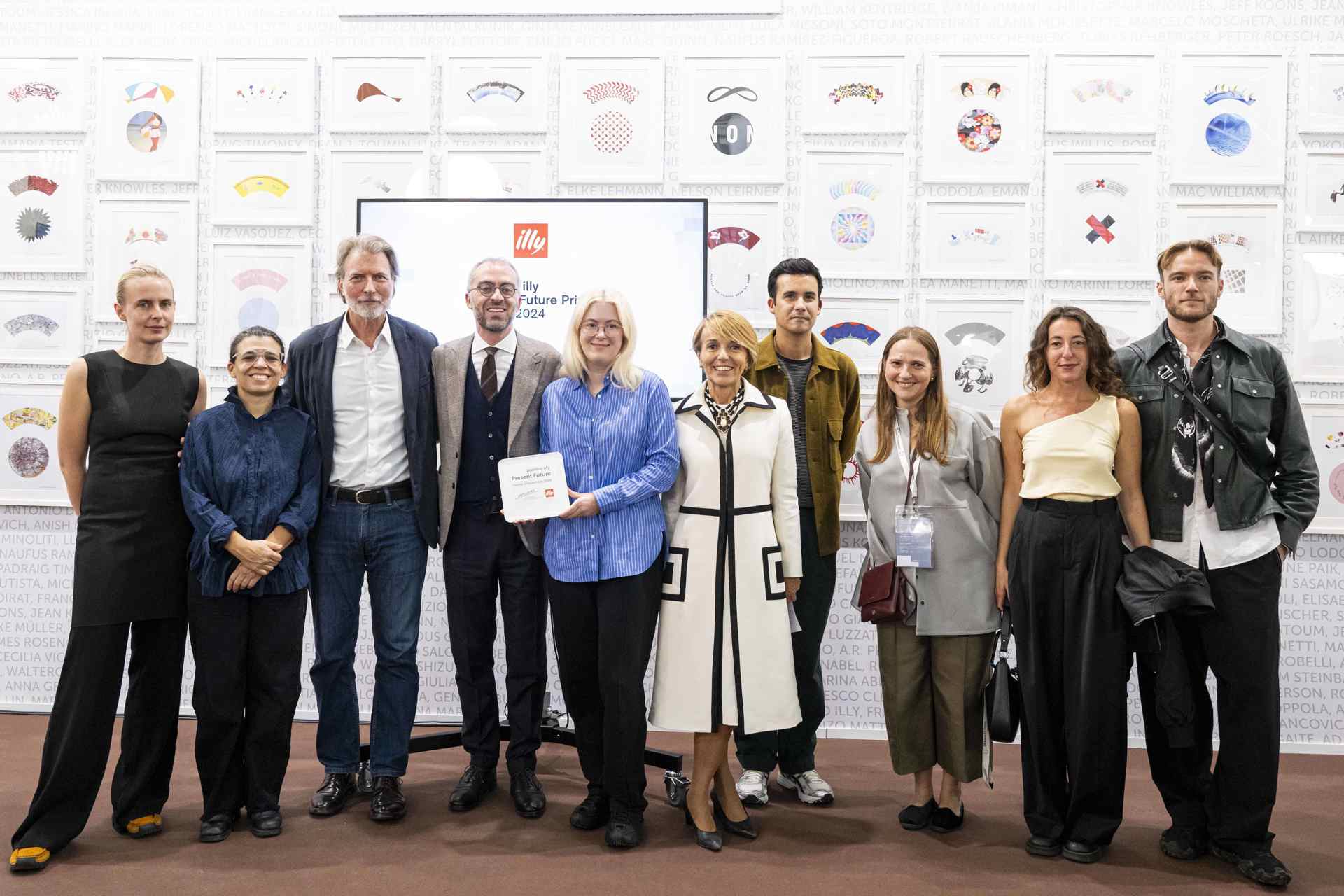 Premio illy Present Future - Maurin Dietrich, giurata, Manuela Moscoso, giurata, Carlo Bach, direttore artistico illy, Luigi Fassi, Angharad Williams, artista vincitrice, Patrizia Sandretto Re Rebaudengo, giurata, João Laia, giurato, Gloria Risi, gallerista, Joel Valabrega e Léon Kruijswijk, curatori Present Future. © Perottino-Piva-Castellano / Artissima 2024