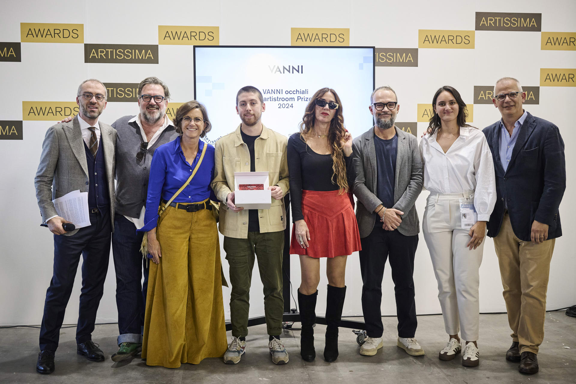 Premio VANNI occhiali #artistroom - Luigi Fassi, Dimitri Borri, giurato, Alessandra Girardi, co-CEO VANNI occhiali, Nicola Bizzarri, artista, Loredana Longo, giurata, Dino Vannini, giurato, Miral Rivalta, gallerista, Giovanni Vitaloni, presidente e CEO VANNI occhiali. © Perottino-Piva-Castellano / Artissima 2024