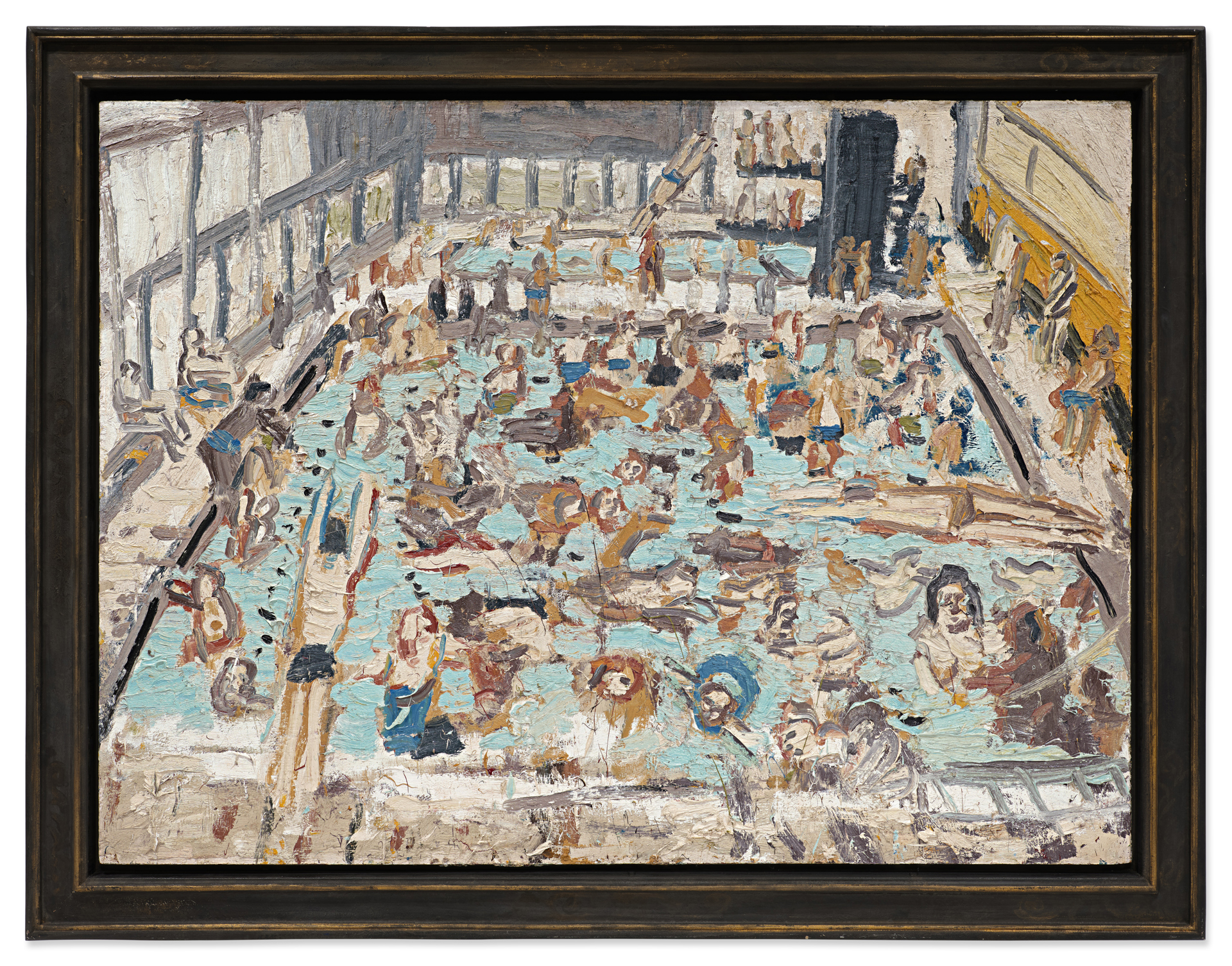 Con Children’s Swimming Pool, 11 O’Clock Saturday Morning, August 1969 (1969), stimato 600-800 mila sterline, Kossoff porta questa attenzione alla fragilità umana in una dimensione quotidiana e corale. Considerato il migliore di una serie dedicata alla piscina pubblica di Willesden, il dipinto appartiene a una fase in cui l’artista si allontana dai paesaggi di macerie e cantieri del dopoguerra per rivolgersi a scene di vita ordinaria. La superficie, costruita con un impasto denso e quasi scultoreo, vibra di luce e movimento. I corpi dei bambini, l’acqua, l’architettura si fondono in un campo pittorico compatto, dove l’esperienza personale - Kossoff portava lì i figli a nuotare - si trasfigura in visione epica. È la dimostrazione di come la School of London non fosse soltanto introspezione individuale, ma anche capacità di elevare il quotidiano a esperienza universale.