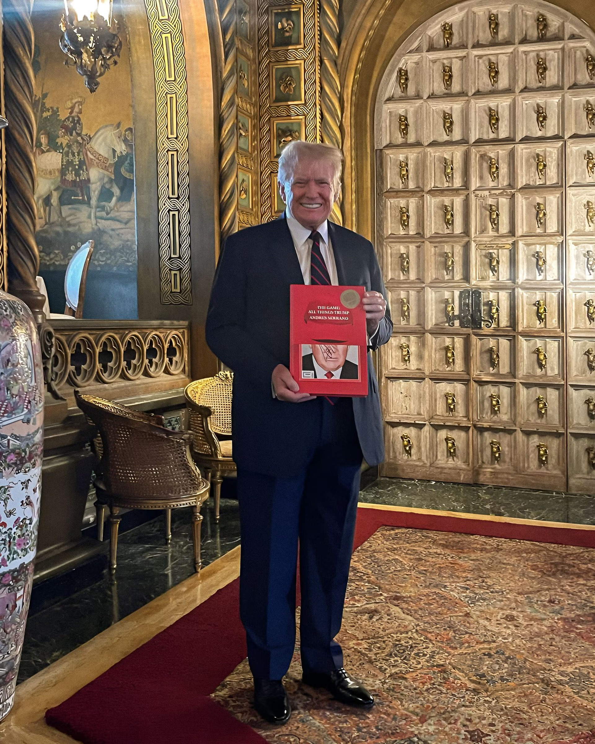 Donald Trump con una copia del libro «The Game: All Things Trump». Photo: Isabelle Brourman