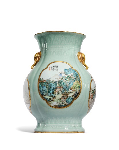 Vaso ovale lobato con fondo celadon inciso e dipinto con “Poesie e paesaggi imperiali” di Yangcai