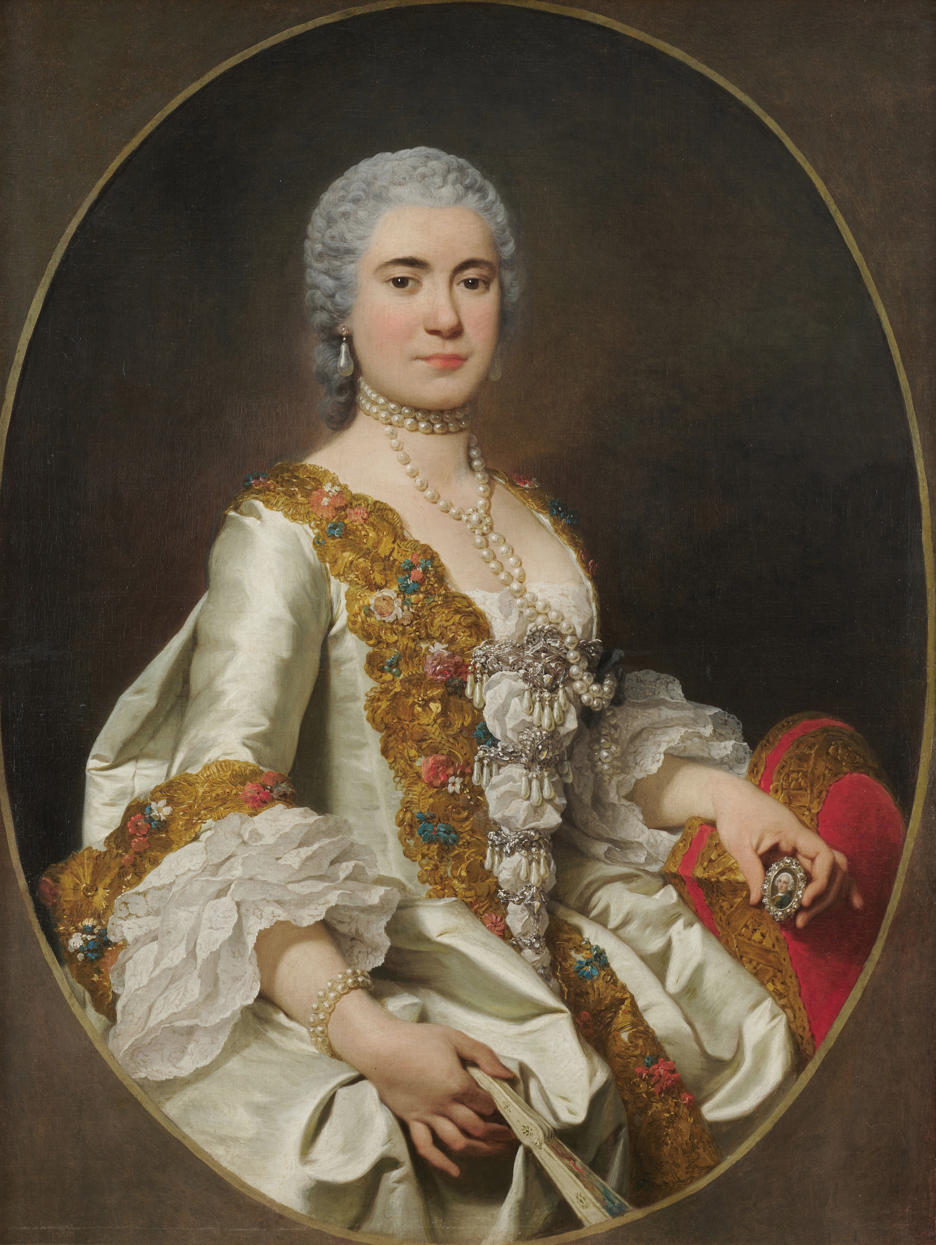 Pierre Subleyras, Portrait of a lady, possibly Maria Vittoria Corsini, half-length, in a lace-trimmed dress and holding a miniature of her husband, Livio II Odescalchi