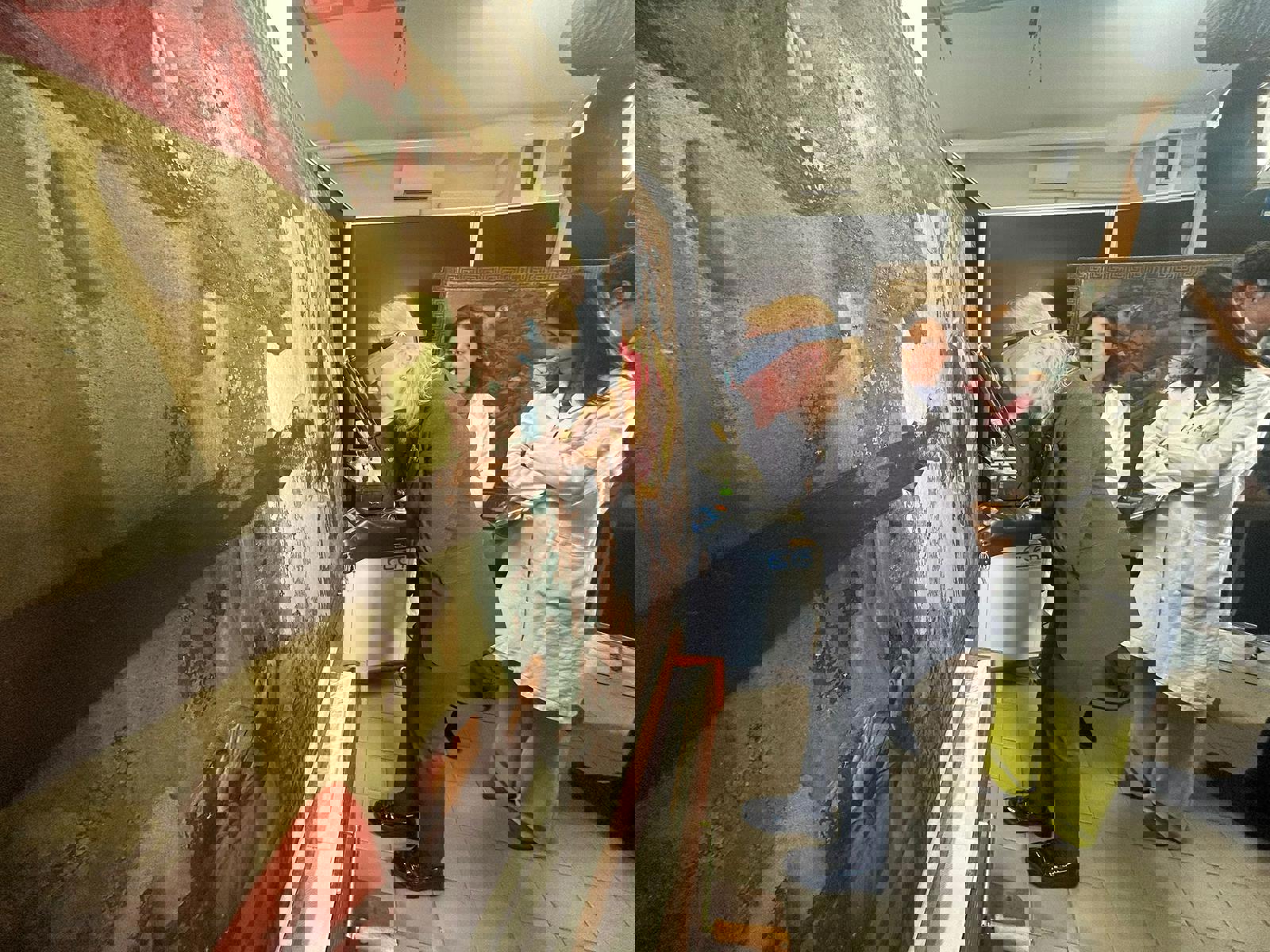 Carmen C. Bambach del Metropolitan Museum di New York esamina lo «Stendardo della Santissima Trinità» di Raffaello, di Città di Castello, nel laboratorio dell’Istituto centrale per il restauro a Roma. Foto Comune di Città di Castello