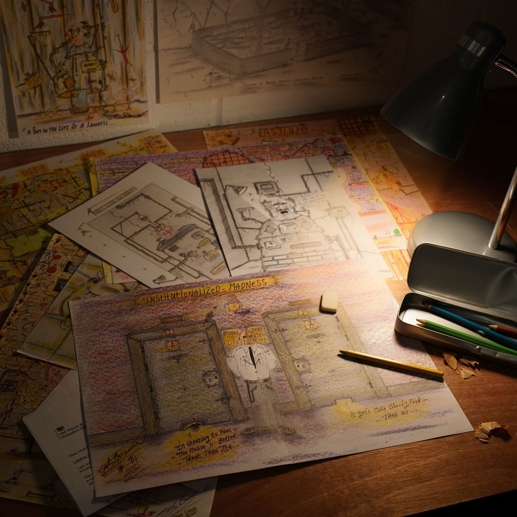 ICharles Bronson (Charles Arthur Salvador), Collezione completa di cinquecento opere realizzate con tecniche miste tra il 2000 e il 2025, durante la lunga detenzione dell'artista. La collezione comprende diversi formati: A5 (15 opere), A4 (308 opere), A3 (164 opere) e A2 (13 opere)