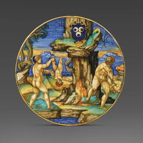 In questa maiolica del 1530 circa il pittore Xanto Avelli (1486 ca-1542 ca) raffigura la drammatica vicenda di Ino e Atamante, ispirandosi alle Metamorfosi di Ovidio. Pur mantenendosi fedele all’interpretazione narrativa tradizionale, modellando i suoi personaggi sulla base di fonti incisorie, l’artista offre una visione originale del mito. Nella maiolica, la figura di Atamante si rifà all’incisione di Nicolas Béatrizet, «La strage degli innocenti»; Ino deriva da un personaggio tratto da «La contesa tra le Muse e le Pieridi» di Gian Giacomo Caraglio, mentre il piccolo Melicerte è una reinterpretazione di un Cupido tratto dai «Cupidi danzanti» incisi da Marcantonio Raimondi. Il piatto dipinto è riccamente documentato e di solida provenienza. Sarà in vendita da Pandolfini il 2 ottobre con una stima tra i 70 e i 120mila euro.