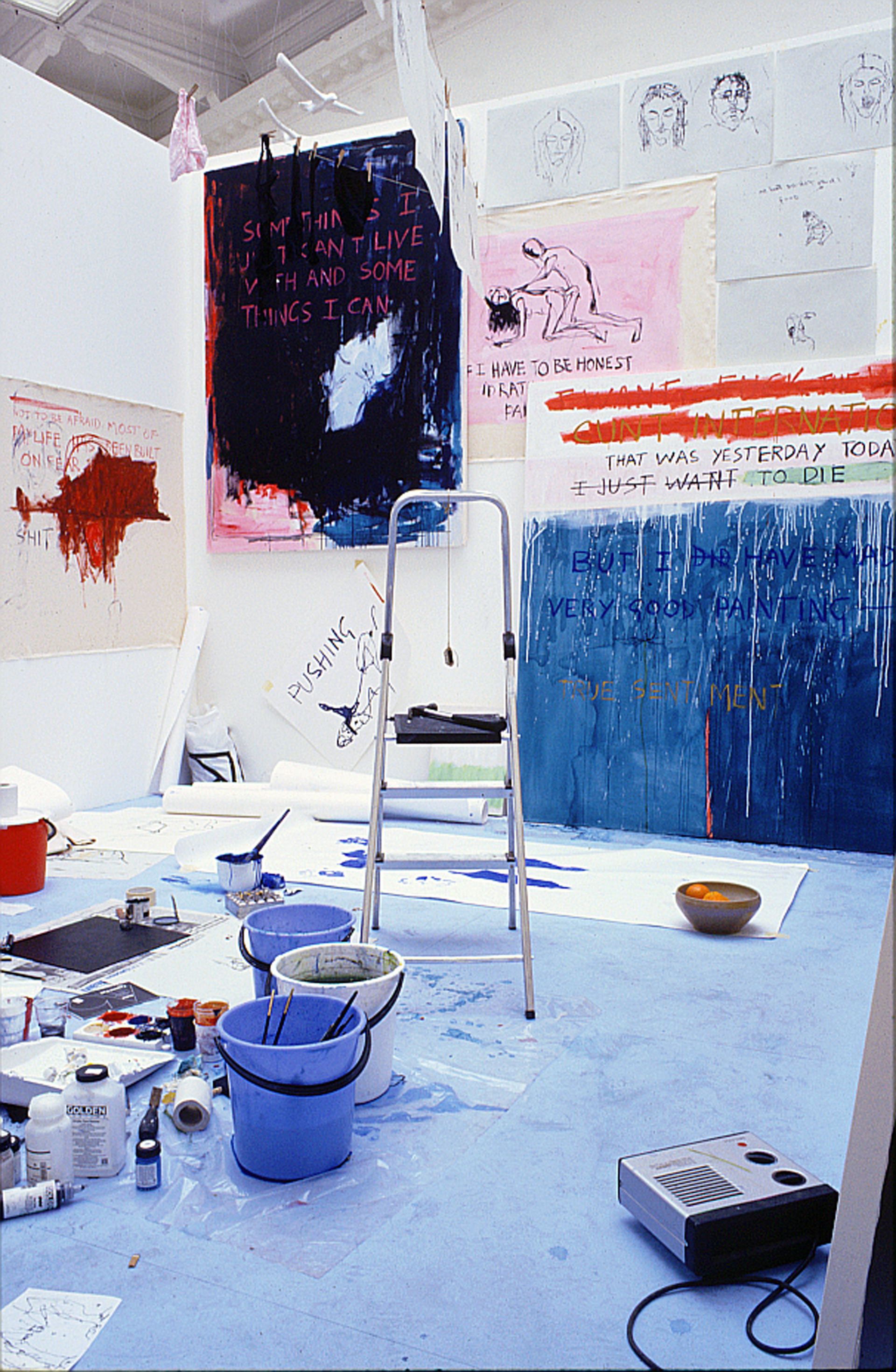 «Se tutto il lavoro che ho fatto, i ricami, i film, le fotografie, le performance, tutto, fosse una montagna, e io mi arrampicassi, arrivassi in cima alla montagna, prendessi l’asta della mia bandiera, la infilassi in modo che la mia bandiera soffi nel vento, quella sarebbe la mia pittura, ha dichiarato l’artista a Louisa Buck. Negli anni Novanta, al Royal College of Art. Avevo due tutor: Ken Kiff mi ha insegnato tutto sui diversi colori e sulla loro miscelazione, mentre Alan Miller mi ha insegnato a preparare le tele e a conoscere i pennelli e tutti i colori che si possono usare. È stato fantastico. Poi ho lasciato l’Università e ho scoperto che la pittura era del tutto inaccettabile negli anni Novanta, soprattutto se eri un pittore figurativo, così ho pensato: “Ok, scriverò”. Così ho iniziato a frequentare quei “giovani artisti”, ed è finita lì: sono stata coinvolta in quel vortice, ero felice di esserlo. Ma non ho mai smesso di disegnare».