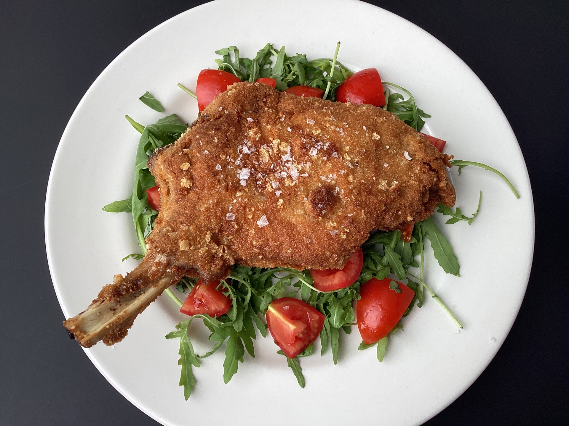 La costoletta di vitello alla milanese, servita con pomodorini Piccadilly e rucola