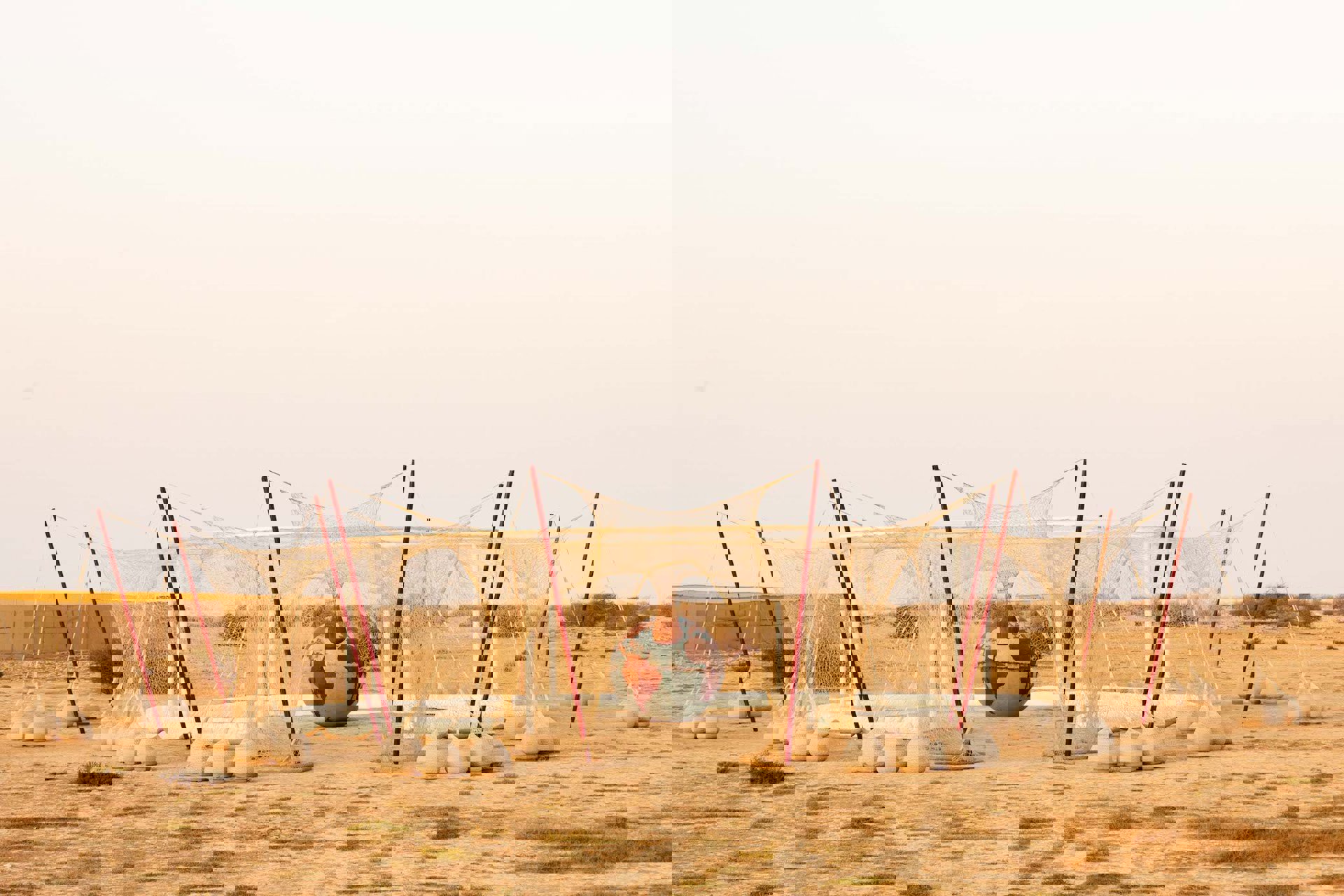 Reinstallata a Ras Abrouq dopo la prima presentazione nel deserto di Zubarah, l’opera monumentale di Ernesto Neto è concepita come una “stanza rituale” abitabile. Tra reti crochet, una struttura ottagonale e una sfera ceramica centrale, il pubblico è invitato a muoversi, sedersi, ascoltare e meditare. L’installazione fonde biomorfismo, Neo-Concretismo e sensibilità tropicalista, proponendo un’esperienza sensoriale che riflette sul legame tra corpo umano, natura ed ecosistemi sociali.