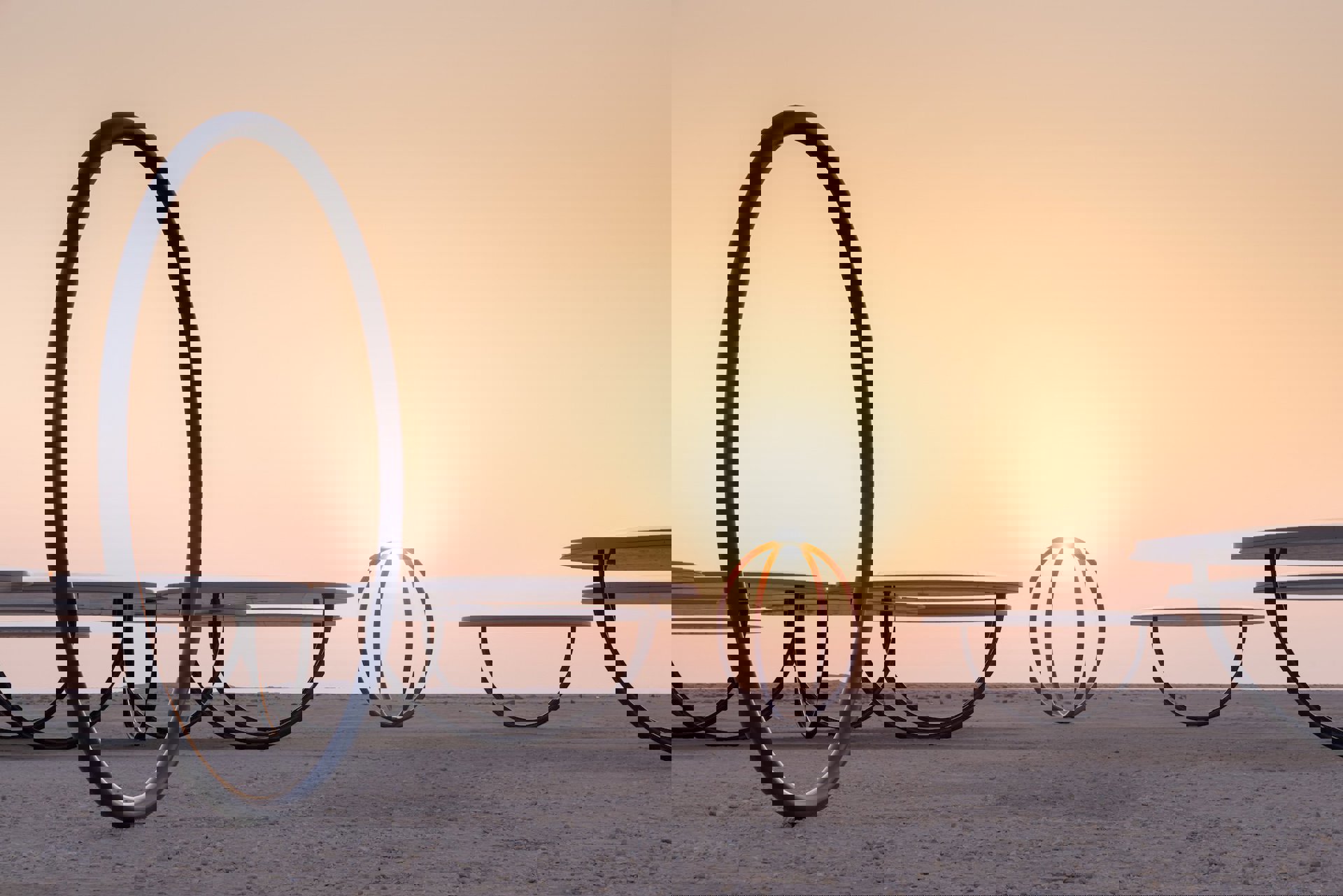 L’opera site-specific di Olafur Eliasson ad Al Zubarah si presenta come un insieme di rifugi circolari apparentemente dispersi nel deserto. A uno sguardo più attento, la disposizione rivela una struttura geometrica rigorosa basata su una simmetria quintupla, con dieci elementi centrali a formare un pentagramma. Questo schema richiama principi matematici riscoperti in Occidente solo di recente, ma già presenti nelle tradizioni decorative islamiche medievali. L’installazione trasforma il paesaggio in uno spazio di percezione e riflessione, dove luce, ombra e movimento diventano parte integrante dell’esperienza dell’opera.