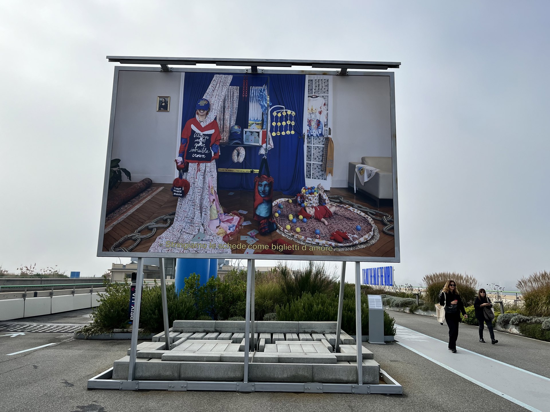Il dialogo di Artissima con il sistema culturale cittadino comprende anche importanti realtà private, per esempio la Pinacoteca Agnelli, a due passi dall’Oval, nel centro commerciale del Lingotto. Sul tesso della Pinacoteca, nel giardino pensile sospeso più alto d’Europa, la Pista 500, dove un tempo si collaudavano i prototipi delle automobili Fiat, ospita una serie di opere ambientali, una è il prodotto di un Premio realizzato ad Artissima. La vincitrice della scorsa edizione è l’artista iraniana residente in Francia Chalisée Naamani (Galleria Ciaccia/Levi). A pochi passi dall’Oval potete dunque ammirare il risultato della sua residenza torinese, il billiboard realizzato fondendo elementi della storia dell’arte rinascimentale e barocca con la storia industriale e commerciale del Lingotto. «Chalisée Naamani, spiega Sarah Cosulich, direttrice della Pinacoteca Agnelli, ha creato un’opera molto complessa in cui lei stessa si mette in posa in uno spazio domestico, il salotto di casa. Il lavoro parla però anche di un messaggio politico, il diritto al voto delle donne (elemento cui allude una catena di stoffa simbolo delle suffragette) e di maternità (si autoritrae in cinta). L’opera è una costruzione scenografica molto attenta, ogni elemento dell’immagine è mirato a dare un messaggio, ogni piccolo dettaglio tocca diversi aspetti della contemporaneità, con un linguaggio anche molto carico e pop e che si connette con lo spazio del Lingotto, del centro commerciale che lei ha esplorato. L’opera è anche il risultato di una sua conoscenza del contesto complesso dello spazio di questo edificio».