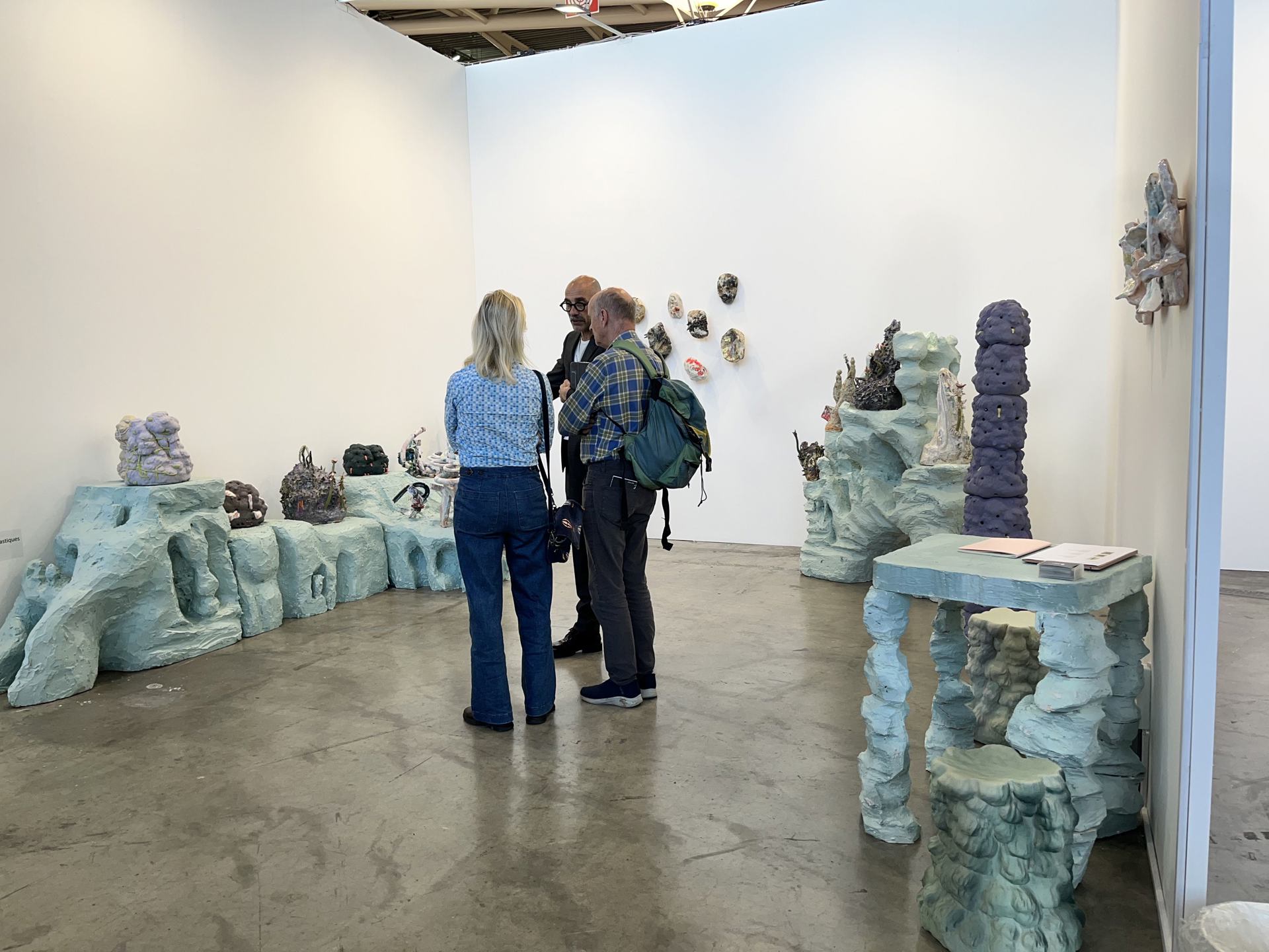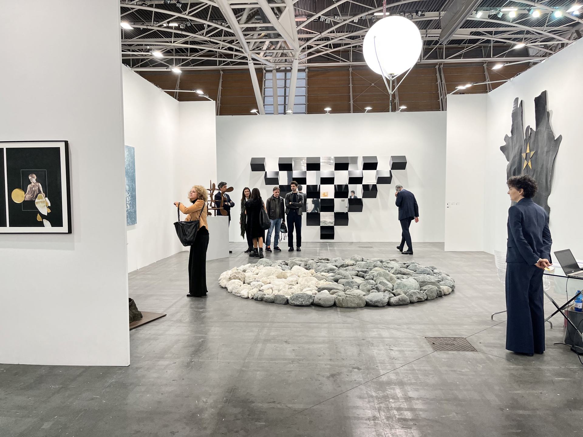 Per molti artisti presenti in fiera l’arte, come la natura, è una dimensione intima e sacra, l’espressione di un valore universale cui si aspira, partendo dal basso. Questa l’idea, per esempio, dietro i lavori dell’artista svizzero Kaspar Müller, esposti da Federico Vavassori (Milano) insieme a quelli dell’amico e collega svizzero Emil Michael Klein. Müller realizza dei lavori molto particolari (da 12mila a 17mila euro), sono dei fogli di carta igienica con impressi motivi floreali che lui stampa su grande formato e che poi, insieme alla sua bimba, ricalca con pastelli a olio colorati. L’immagine, semplice e poetica, è come un mandala reiterato all’infinito. Klein, invece, realizza dei dipinti monocromatici color blu notte (da 13mila a 16mila euro), rigorosamente con la stesura di lunghe e precise pennellate che formano una texture geometrica, in questo caso una croce: un gesto e un processo pragmatici per approdare a una dimensione puramente spirituale. Ma quello con la natura e con il mondo non è sempre un equilibrio sano e perfetto. Una distorsione antropica della natura la si ha, per esempio, nel lavoro dell’artista colombiano Miguel Angel Rojas, cui la galleria lacometa (Bogotà) dedica l’intero stand. I suoi lavori affrontano il rapporto tra questioni ecologiche ed economie illecite attraverso sculture simili a potenti e fragili frottage che si sgretolano lasciando intravedere la superficie sottostante e mettendo in risalto il degrado ambientale e l’estrazione intensiva delle materie prime. Un’altra distorsione è quella alla base dell’opera di Jakob Assay, da Art Conept (Parigi). I suoi lavori sono immagini di tavole di truciolato ricoperte dai medesimi listelli di legno riprodotti nell’immagine, ma invece che essere perfettamente sovrapposti sono lievemente disallineati, creando così un effetto sfocato che per l’occhio non è possibile evitare (da 25mila a 50mila euro). Sono molti gli artisti in fiera che si interrogano su ciò che è vero e su ciò che è falso. Bastien Gachet, cui la Galleria Enrico Astuni (Bologna) dedica una personale, riempie lo spazio con un’unica grande installazione, di respiro museale, vendibile intera o in singole parti (37.500 euro per l’intera installazione). È una struttura immersiva in cui si riconoscono oggetti apparentemente familiari, come parti di siede e dispenser di sapone, oggetti industriali che lui, invertendo il processo, riporta a una condizione pre-industriale, facendone degli oggetti unici. Altamente poetico è il lavoro di Zilvinas Landzbergas. Lituana, rappresentata dalla galleria Meno Parkas Gallery (Kaunas): riproduce sotto forma di piccole miniature in legno sospese delle casette islandesi abbandonate (7.000 euro), chiuse e inaccessibili, come i ricordi e le storie che esse contengono.
