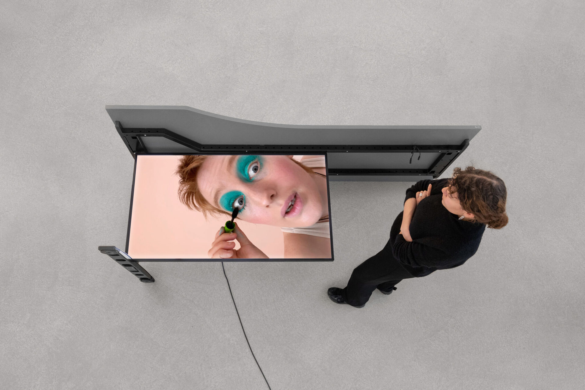 The Bots (2020) di Eva e Franco Mattes affronta direttamente l’infrastruttura che regola la selezione del visibile. L’opera consiste in una serie di video basati su interviste a moderatori di contenuti dei social media, realizzate in collaborazione con il giornalista Adrian Chen. Attori leggono le testimonianze di lavoratori incaricati di visionare e classificare immagini violente, mentre adottano tecniche visive derivate dai tutorial di make-up, utilizzate per aggirare i sistemi di censura automatica. I video sono installati sul retro di scrivanie che replicano quelle dei centri di moderazione. I racconti rendono visibile il lavoro invisibile che decide cosa può restare online e cosa deve scomparire.