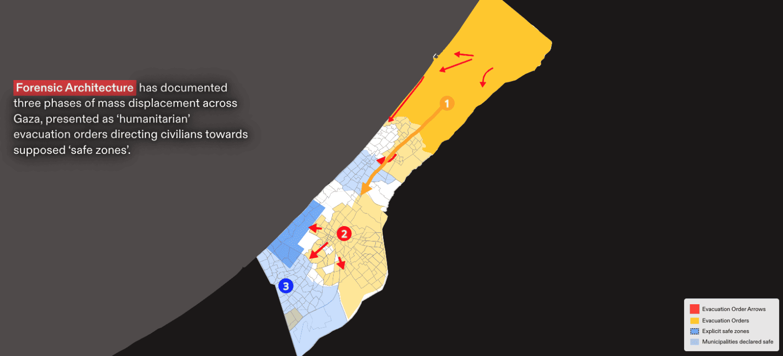 Nell’ottobre 2025 il collettivo Forensic Architecture pubblica un nuovo aggiornamento del progetto avviato nel 2023 per documentare le operazioni militari a Gaza attraverso l’analisi incrociata di immagini satellitari, video amatoriali, registrazioni audio e dati open source. Il lavoro si presenta come una serie di mappe, modelli spaziali e ricostruzioni temporali che assemblano frammenti dispersi in assenza di accesso diretto ai luoghi. In queste indagini la guerra non appare come immagine immediata o spettacolare, ma come un insieme di tracce da verificare: coordinate, ombre, suoni, detriti. L’immagine smette di funzionare come prova autosufficiente e diventa parte di un dispositivo di accertamento, in cui la verità emerge dalla ricostruzione e dalla correlazione dei dati, più che dalla visibilità diretta degli eventi.