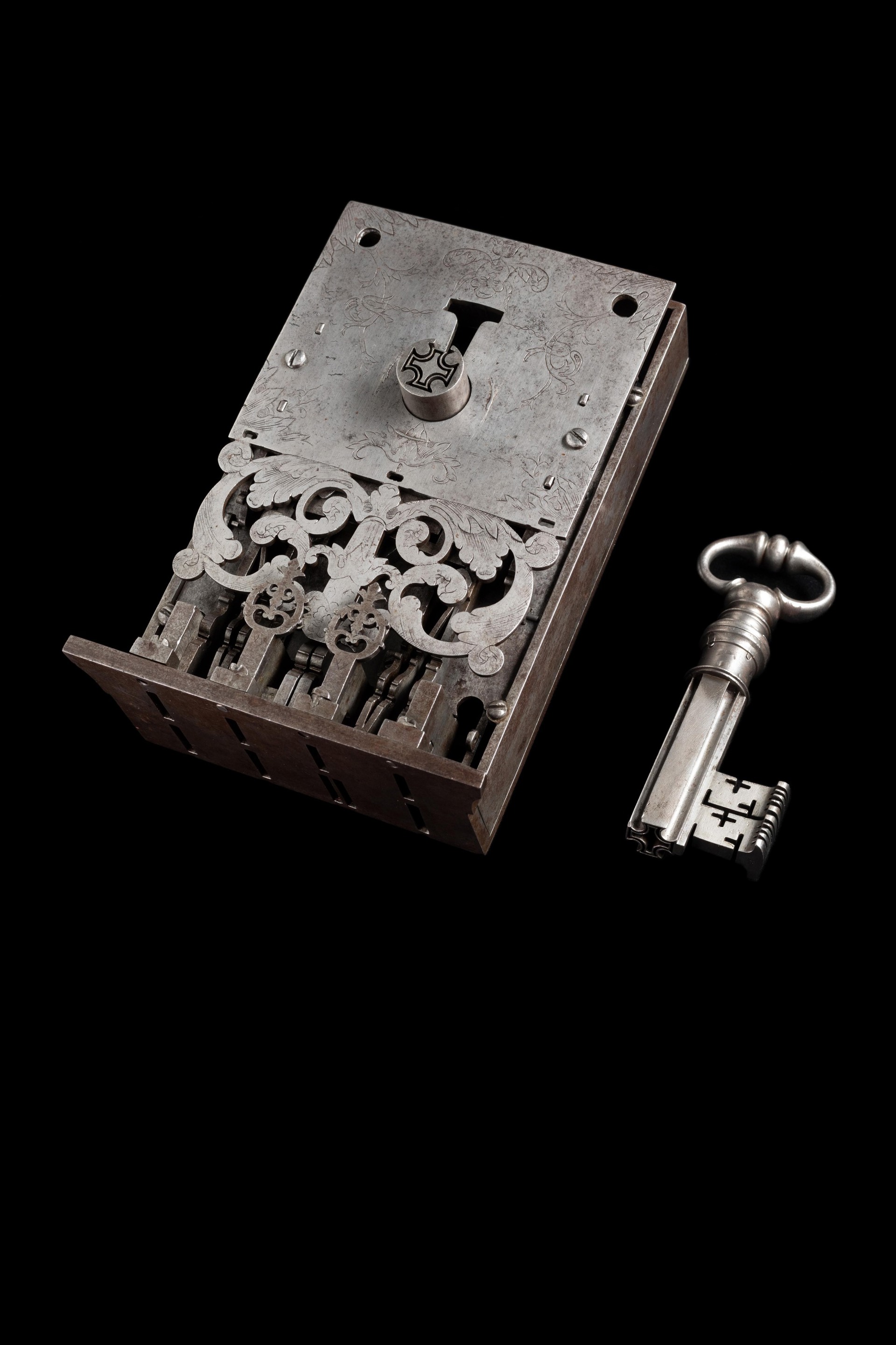 Dalle forme essenziali dell’Alto Medioevo, caratterizzate da strutture semplici e funzionali, la chiave evolve progressivamente a partire dal XIV secolo. Tra Gotico, Rinascimento e Barocco, l’abilità dei fabbri serraturieri trasforma questi strumenti in oggetti di grande raffinatezza formale, dove l’ingegno meccanico si unisce a soluzioni decorative sempre più elaborate.
