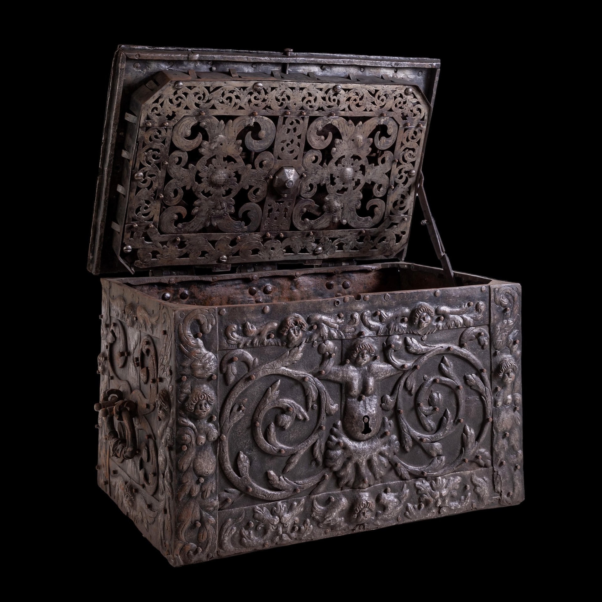 Raro forziere rinascimentale da carrozza in ferro. Germania, XVI secolo