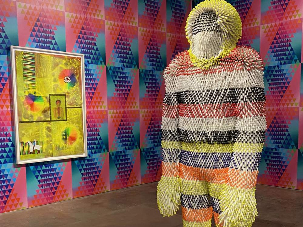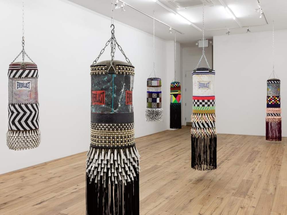 Le note sculture sospese a forma di sacchi da boxe realizzate da Jeffrey Gibson
