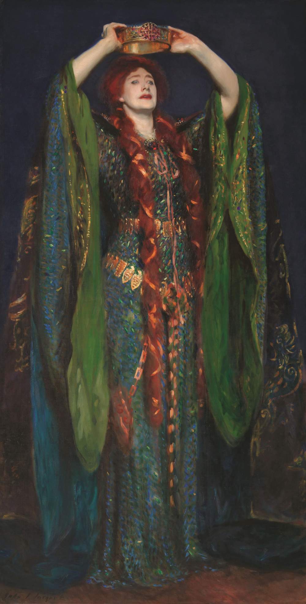 Forte di una serie di prestiti eccezionali, tra i quali «Madame X (Madame Pierre Gautreau)» (1883-84), proveniente dal Metropolitan di New York, la rassegna abbina diversi ritratti con gli abiti reali raffigurati nei dipinti, svelando come Sargent manipolasse l’abbigliamento per raggiungere gli obiettivi desiderati. Tra i 73 dipinti e oggetti in mostra è incluso il ritratto del 1889 di Ellen Terry nei panni di Lady Macbeth, esposto accanto all’abito verde muschio, ricamato con vere ali di scarabeo iridescenti, che l’attrice indossò in una celebre produzione londinese di Macbeth. Nel dipinto, Sargent mostra la Terry mentre si incorona, con il suo fluente abbigliamento gotico che da solo sembra un’intera scenografia anziché un semplice costume.