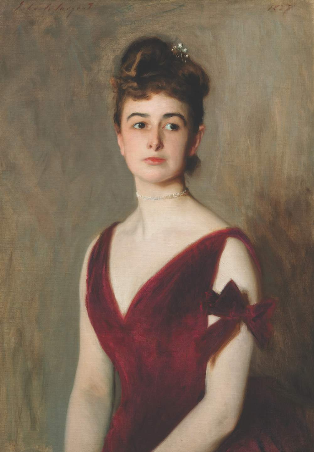Nomade per tutta la vita, Sargent (1856-1925) nacque a Firenze da genitori americani. Il suo approccio eurocentrico alla ritrattistica affonda le radici nella sua formazione parigina e in una profonda affinità con l’olandese Frans Hals e lo spagnolo Diego Velázquez. Ma attraversò anche l’Atlantico, e la mostra conferma il suo interesse per lo stile americano in «Mrs Charles E. Inches (Louise Pomeroy)», un ritratto del 1887 della «socialite» di Boston. Il ritratto è accompagnato dal suo abito da sera in velluto di seta rossa, conservato nella collezione del museo di Boston.