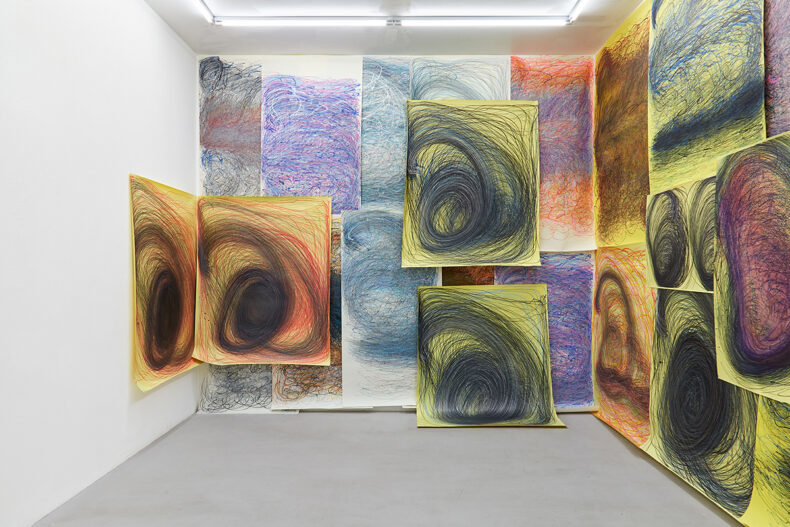 Il suo lavoro è difficile da imbrigliare. Le prime tracce erano piccole costellazioni di colore, file ordinate che tornavano su se stesse. Poi, all’improvviso, verso il 2013, la linea ha iniziato a girare in tondo e il disegno si è trasformato in vortice. La spirale, come spinta da una necessità interna, si è fatta più ampia, più densa, più insistente. Da lì è partita la seconda metamorfosi. Quando Kalu ha avuto accesso a spazi più ampi, la bidimensionalità è esplosa in scultura. Ha iniziato a fasciarsi intorno a ogni supporto possibile, inglobando grate, pilastri, serrande, generando strutture che crescevano come organismi. Da piccoli nuclei si è arrivati a forme monumentali, sospese, multicorpi.