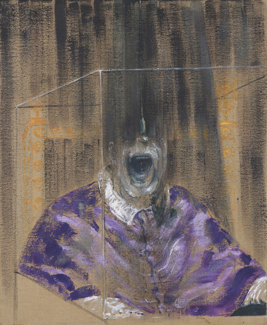 Erica Brausen, che intanto si era messa in proprio aprendo a Londra la Hanover Gallery, fu la prima a esporre gli altrettanto celebri dipinti della serie ispirata dal «Ritratto di Innocenzo X» di Velázquez, iniziata alla fine degli anni Quaranta e proseguita per tutto il decennio successivo e in parte degli anni Sessanta. L’artista, parlandone con Sylvester, avrebbe preso le distanze da quei dipinti, anche se, per notorietà, il papa urlante (ispirato dal fotogramma dell’urlo della donna con il pince-nez colpita dai cosacchi nel film «La corazzata Potëmkin» di Ejzenstejn) potrebbe stare a Bacon come Marilyn sta a Warhol: «Ho sempre pensato che [il papa di Velázquez] fosse uno dei più grandi dipinti dell’arte mondiale (…). E ho tentato, con scarso, scarsissimo successo, di farne delle registrazioni: registrazioni distorte. Rimpiango di averlo fatto, perché ritengo che siano molto stupide». Anche in questo caso lavorò sempre da fotografie dell’opera, che non vide mai dal vero. Del ’53 è «Two Figures», due nudi maschili che lottano (come nella foto di Muybridge da cui l’opera è tratta) o si accoppiano. Nel dipinto, che appartenne all’amico Lucian Freud, chi sta sopra forse è uno dei grandi, distruttivi amori di Bacon, Peter Lacy, un ex pilota militare che gli fu compagno dal 1952 al 1962, quando morì.