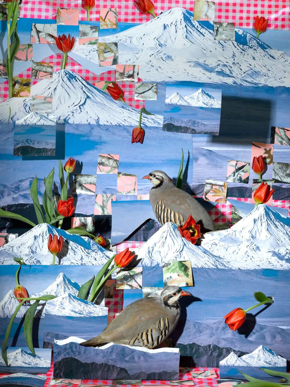 Presentato per la prima volta a Providence College Galleries nella primavera del 2022, e successivamente allestito con nuove integrazioni al Museum of Fine Arts di Boston («Banner Project») e alla Denny Gallery di New York («Birds of Passage»), questo corpus vede Soleimani documentare i suoi genitori all’interno di scenografie ipnotiche, realizzate con i materiali più disparati: da semplici ritagli di carta colorata, fotografie di ambientazioni che fanno eco al passato della sua famiglia e tovaglie di cera sgargianti, a uccelli, disegni e caratteri arabici, frutta, rami, valigie d’epoca e tappeti persiani.
