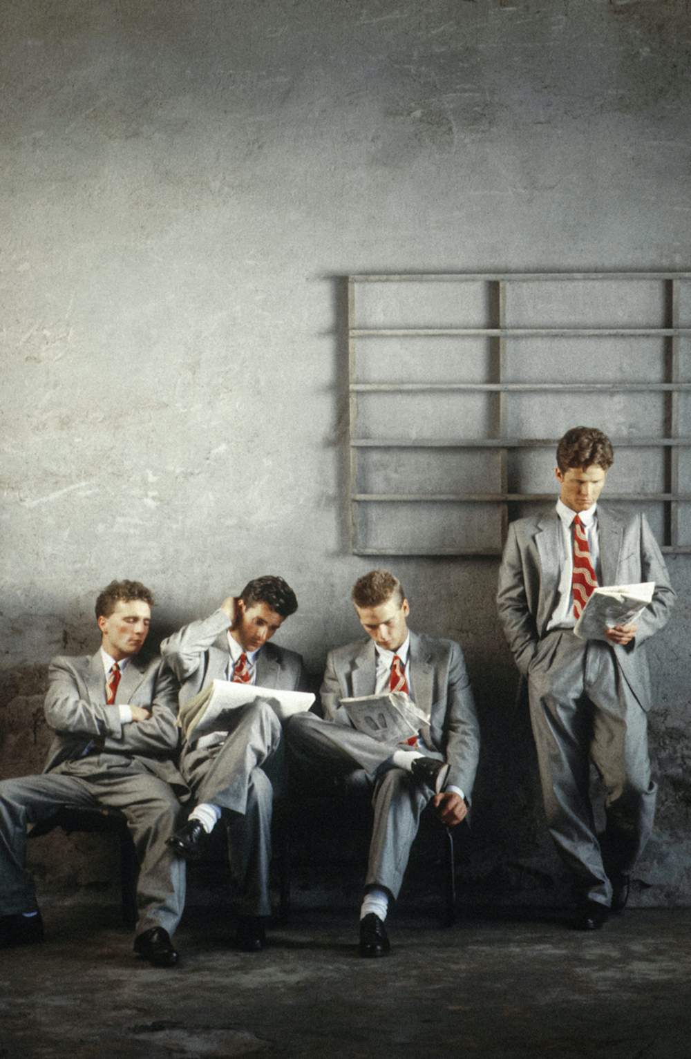 E poi gli uomini, sempre più attenti alla propria immagine. Ma anche istanti di vita catturati da eventi scaturiti dal caso come quando a Palermo, per ripararsi dalla pioggia, la troupe si rifugia nel Circo Togni e nasce la fotografia (una delle rare a colori) per Armani Jeans SS 1981, con un cucciolo di tigre fra le mani del modello.