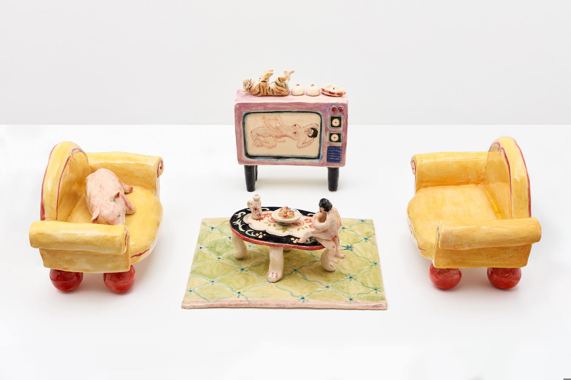 Shafei Xia ci ha abituati alla sua figurazione irresistibilmente raffinata e provocatoria. Allo stand di p420 torna con una doppia presenza: da un lato i suoi inconfondibili acquerelli su carta di sandalo intelata, dall’altro un gruppo di ceramiche che ricrea un piccolo salotto domestico. Le figure tipiche del suo immaginario - animali antropomorfi e corpi immersi in gesti di desiderio - animano la scena con un erotismo sospeso tra ironia e sogno. Un maiale dorme sul divano mentre, alla TV, scorre una sequenza di sesso tra umani che sembra contagiare gli altri abitanti del salotto, avvinghiati in un abbraccio sul tavolino. Ma silenzio: che nessuno svegli il maiale…