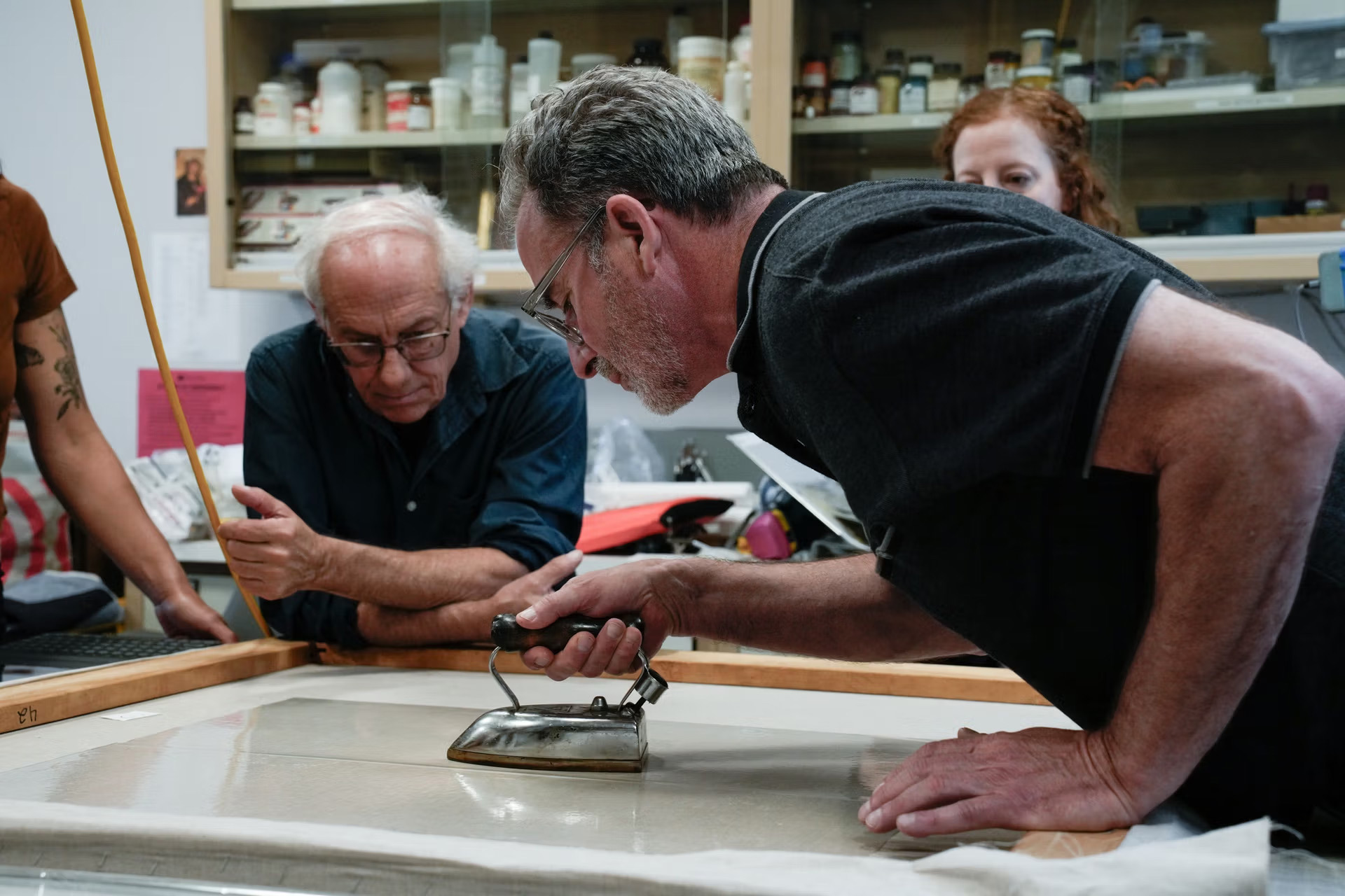 I I restauratori Dean Yoder (in primo piano) e Matteo Rossi Doria testano su una tela il Beva 371 Akron presso il Conservation Center dell’Institute of Fine Arts della New York University. Foto: Nita L. Roberts