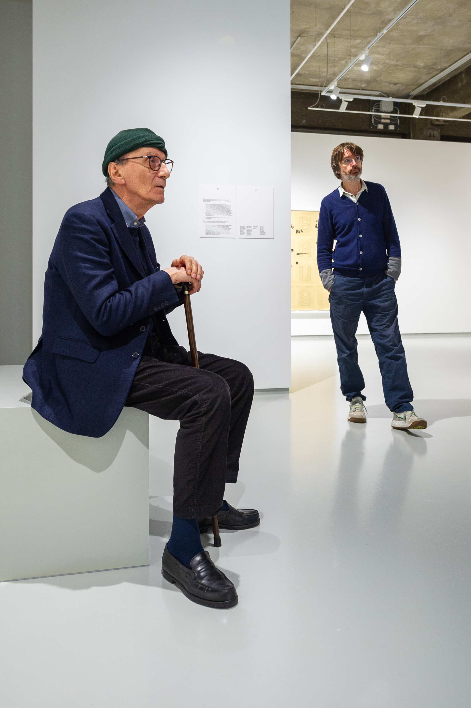 Nella Fondazione a lui dedicata, Giorgio Griffa, classe 1936, dialoga con l’artista britannico Simon Starling, trent’anni tra loro. È sicuramente una delle mostre più speciali, tra opere che si muovono come dittici a doppia firma e relative conversazioni accadute tra i due artisti. Spesso la relazione è empatica, come è stata la storia della loro amicizia. Un pennello al centro, quello che Starling acquista in Giappone in una bottega dove si producono le lacche urushi secondo una tradizione millenaria. Un pennello fatto con i capelli delle pescatrici giapponesi di perle ama, molto compatti per la lunga permanenza in mare e l’assenza di lavaggi con shampoo chimici. È lo strumento magico con cui i maestri delle lacche nipponiche conferiscono l’ultima patina, quella che rende la superficie uno specchio. Un rituale magico, una forma di pittura. Per questo, quando Starling conosce Griffa a una cena nel 2017, capisce che è lui il maestro a cui deve consegnare quel pennello, che non hai mai usato e tiene custodito come uno strumento prezioso, e un po’ misterioso. Così comincia. Ne nascono 3 carte che Griffa dipinge con i suoi codici, che sono segni e alfabeti immaginifici, dove plasma lettere, numeri e forme libere. Starling vi sovrappone una sua scrittura di lettere e parole, stampandola su un vetro e creando, così, una composizione a 4 mani. Sono Noise, Oblique 3 e Golden Ratio (quest’ultimo sarà presentato nella personale di Griffa che apre il prossimo 5 novembre alla galleria Casey Kaplan di New York). Nella mostra si incontrano anche l’opera più vecchia di Starling e quella più nuova di Griffa, invertendo il tempo su varie traiettorie. Poi, si trovano le opere che gli artisti si sono scambiati come doni e altre che hanno sentito di abbinare come dittici spontanei. C’è energia, purezza, verità e poesia, mai didascalica, mai gridata, come si addice ai grandi artisti.