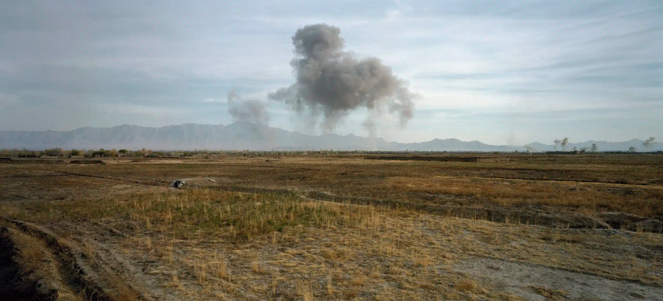 Luc Delahaye, «Bombardamento statunitense sulle posizioni dei talebani», 2001. Courtesy Luc Delahaye e Galleria Nathalie Obadia, Parigi / Bruxelles.