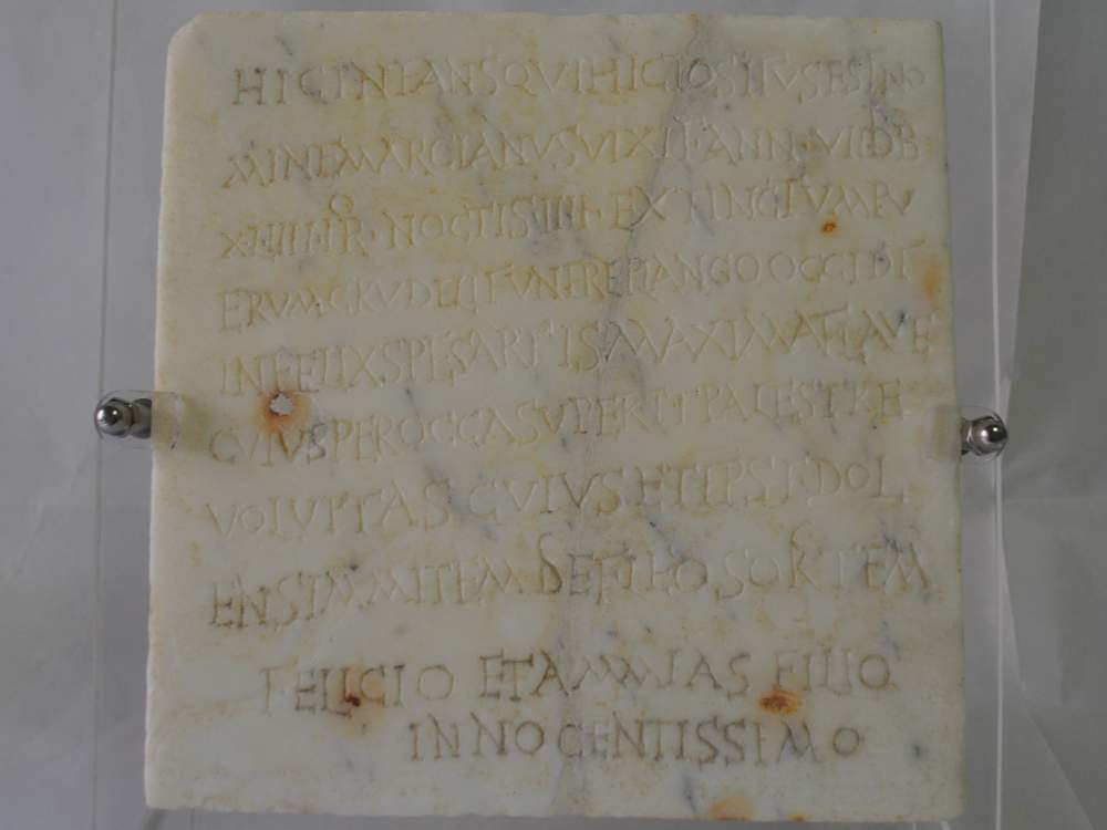 Tra i reperti recuperati vi è poi l’epitaffio del piccolo Marcianus, proveniente dalle catacombe di Domitilla. Il testo, impaginato su una lastra quadrangolare di piccole dimensioni, è particolarmente interessante sia dal punto di vista del contenuto, sia della paleografia. Il piccolo defunto, morto a soli sette anni, viene compianto con parole accorate dai suoi genitori, che in lui vedevano una promessa dei giochi circensi. Ma un incidente mortale, la caduta in un luogo paludoso, pose precocemente fine alla sua passione sportiva.