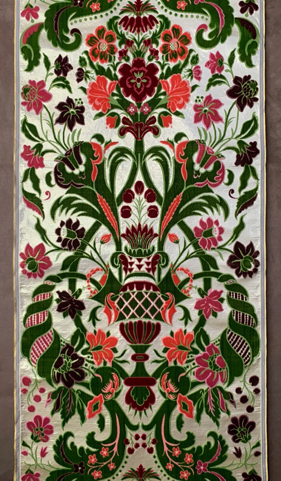 Il velluto impiegato si caratterizza per un disegno comprendente delle cornucopie. È un esemplare solenne che venne esposto alla Mostra del Barocco Piemontese, svoltasi a Torino nel 1963, con un’attribuzione di M. Viale Ferrero alla manifattura serica sabauda, l’Albergo di Virtù, e una datazione al principio del Settecento. Ma la fortuna del velluto giardino con cornucopie non finisce qui, in quanto comprende un importante e non comune rifacimento storico ad opera del tessitore di seta Franz J. Ippoldt, titolare dell’atelier di tessitura a mano Soierie des Fantasques.