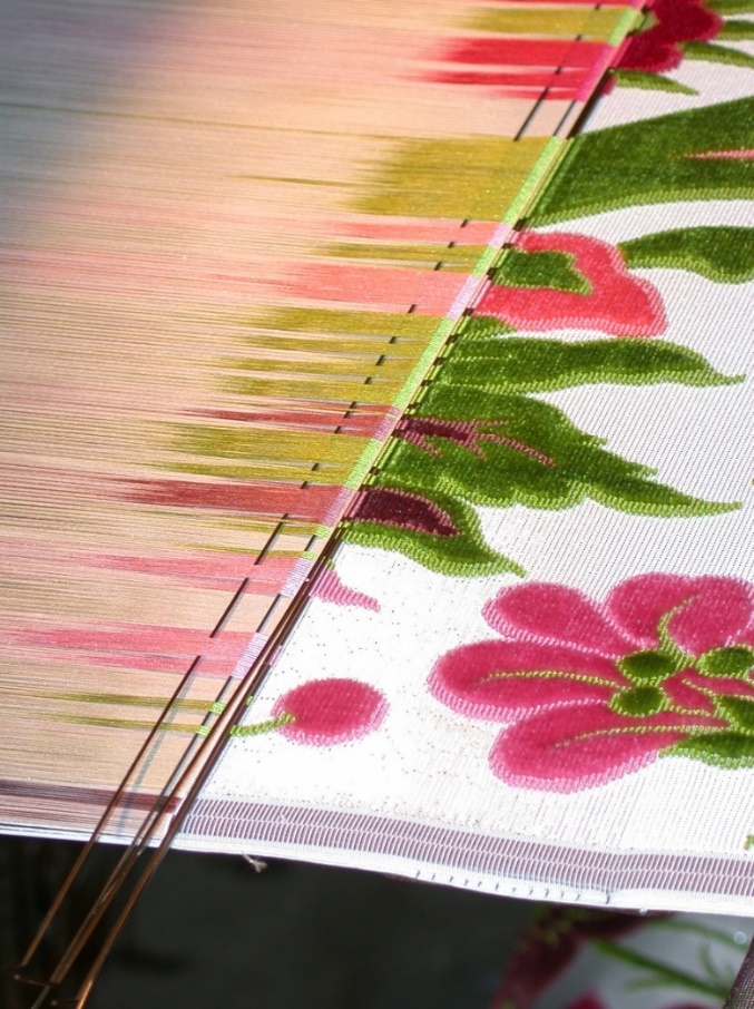 Tessitura del velluto: si osserva il colore in gradazione dei fili di seta e l’inserzione dei ferri per la formazione del pelo. Foto: Franz J. Ippoldt