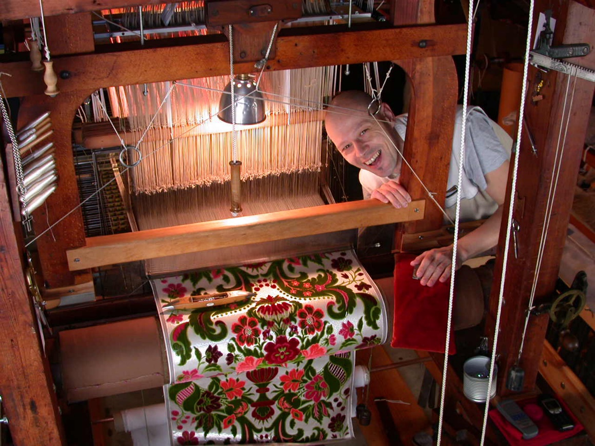 Franz J. Ippoldt al lavoro: il telaio di legno della metà del XIX secolo monta una macchina Jacquard. Foto: Franz J. Ippoldt