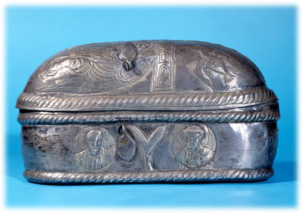 Ancora, fra gli oggetti più rari e preziosi del «Tesoro», figura la Capsella con l’«Adorazione della Croce» (Capsella Vaticana), recentemente restaurata presso i nostri laboratori ricorrendo a una innovativa tecnica di pulitura al plasma. Si tratta di una pisside in argento della prima metà del VII secolo, di forma ovale, con coperchio bombato decorato da una crux gemmata, ai cui lati sono due figure angeliche con le braccia levate in gesto adorante, mentre in alto appaiono la dextra Dei (mano destra di Dio) in atto benedicente e una colomba in volo recante la corona del martirio. Sul lato destro, figurano il busto di Cristo tra quelli dei due apostoli Pietro e Paolo. Di area costantinopolitana è, con la stauroteca dipinta con Pietro e Paolo, anche il magnifico reliquario ovale con la crocifissione niellata, del secolo XI-XII.